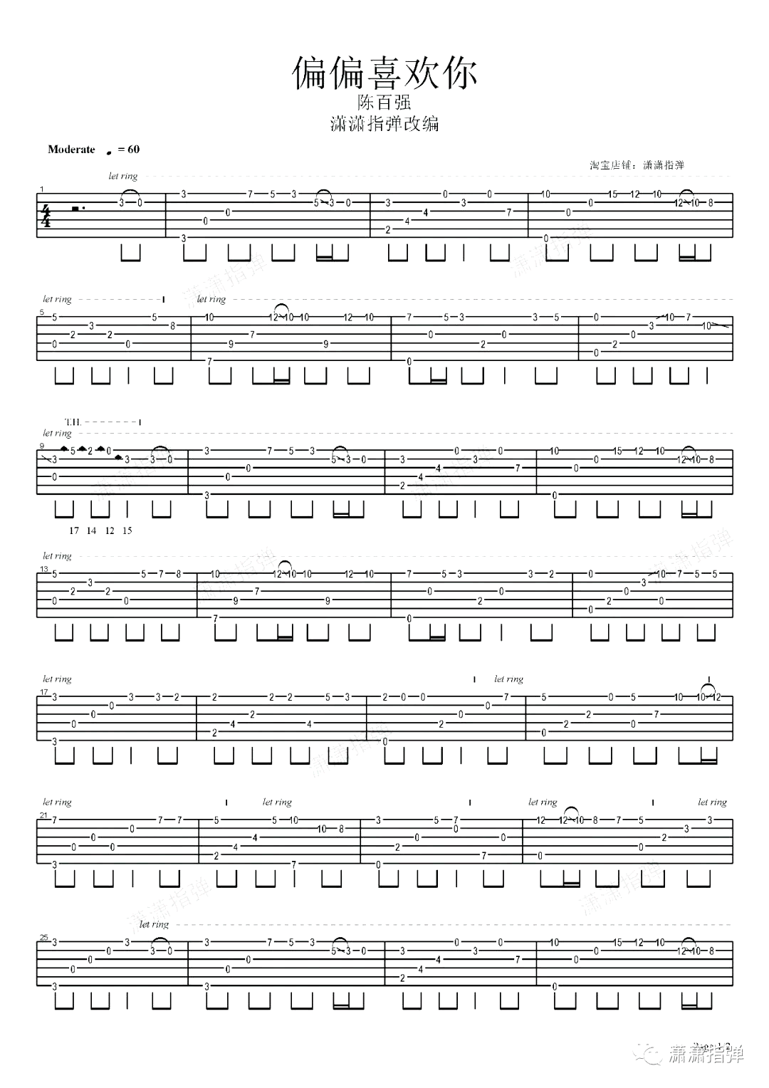 曲谱介绍: 吉他谱介绍:偏偏喜欢你指弹吉他谱,陈百强的一首指弹吉他曲目,这首曲子采用的是标准调弦,4/4拍的节奏,无需特殊调音。演奏时可不夹变调夹,曲谱由琴谱网更新上传,共2张高清图片指弹吉他谱例,来源于@潇潇指弹编配出品。这首歌就像是周启生、陈百强兄弟情的一份纪念,寄托追思之情,让听众潸然泪下。而潇潇老师改编的指弹吉他版本,也是恰如其分。 偏偏喜欢你指弹吉他教学