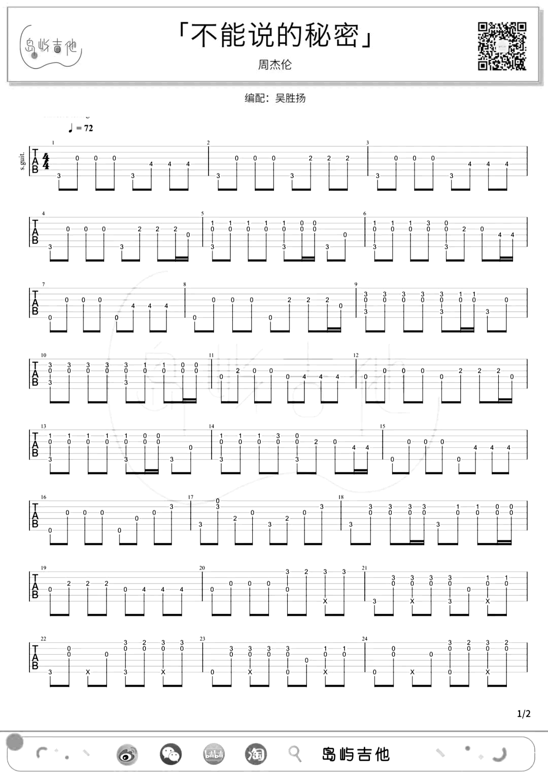 曲谱介绍: 吉他谱介绍:不能说的秘密指弹吉他谱,周杰伦的一首指弹吉他曲目,这首曲子采用的是标准调弦,4/4拍的节奏,无需特殊调音。演奏时可不夹变调夹,曲谱由琴谱网更新上传,共2张高清图片指弹吉他谱例,来源于@岛屿吉他编配出品。很老也很经典的一首歌了,方文山的歌词写得很生动,特别是描述“不能说的秘密”那种心境更是微妙。整首歌配合电影的意境,令歌迷感觉太过凄美。 不能说的秘密指弹吉他教学