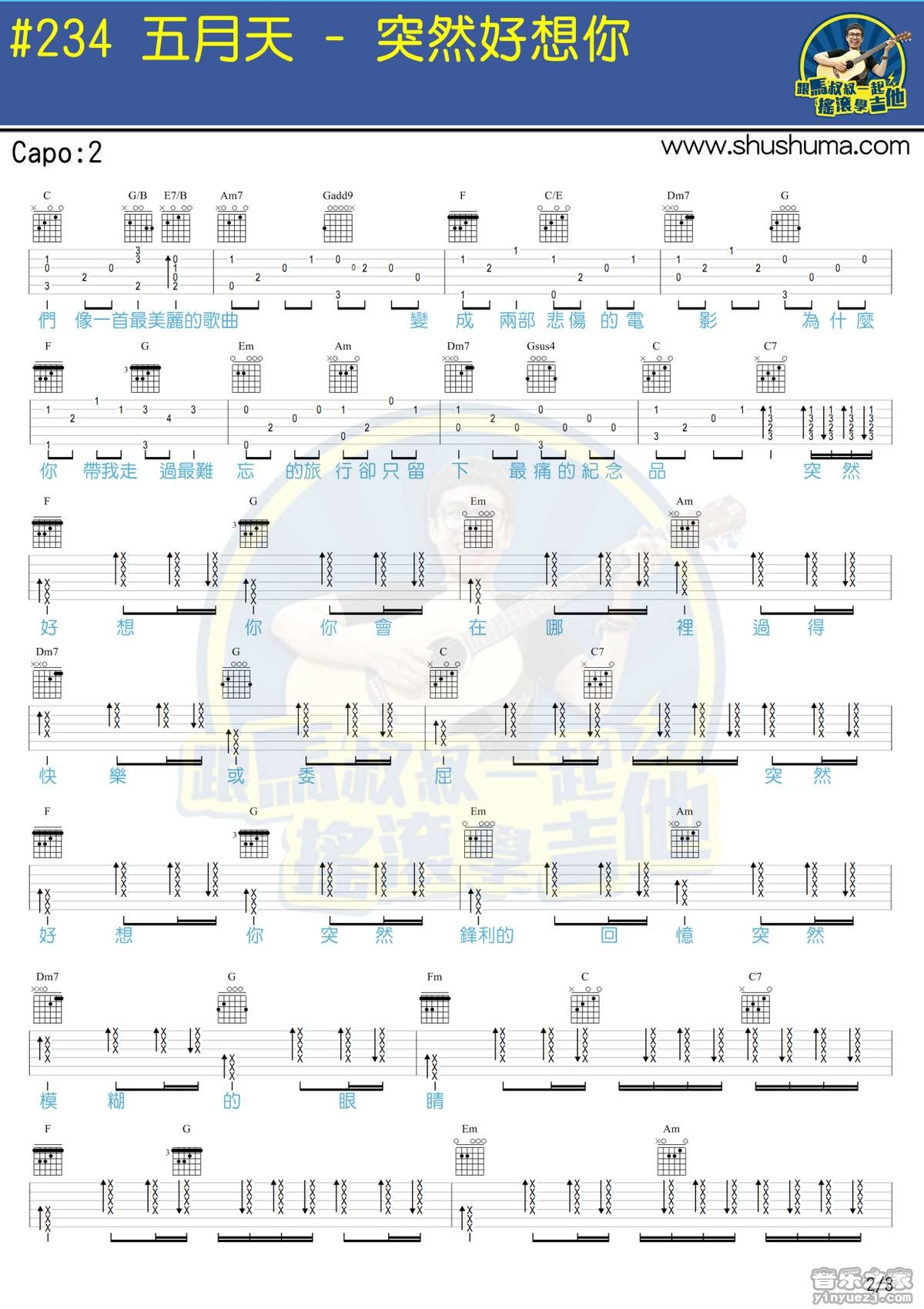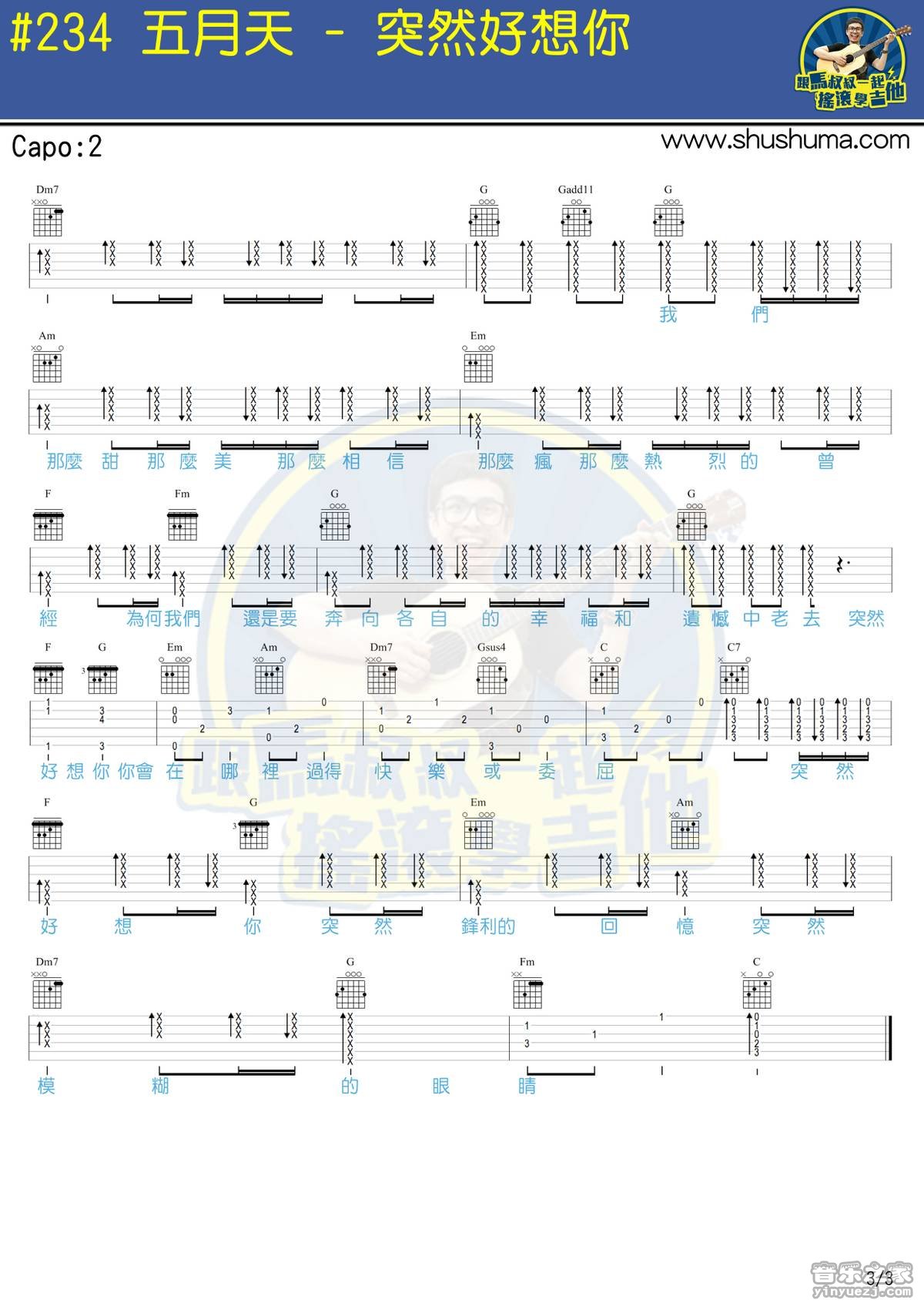 曲谱介绍: 吉他谱介绍:好想你吉他谱,朱主爱演唱的一首歌曲,4/4拍的节奏,这首歌曲的原调为F调,这里曲谱采用了C调指法进行编配,演唱时夹变调夹5品可回到原调,也可根据个人实际嗓音情况选择。曲谱由琴谱网更新上传,共3张高清图片弹唱吉他谱例,来源于@马叔叔编配出品。这首一首曾经风靡全国的甜歌,虽然旋律比较简单,但是却充满了甜蜜的气息。这个版本的吉他谱编配比较还原原版,难度不大,不懂的地方可以看搞怪的马叔叔教学。 好想你吉他弹唱教学