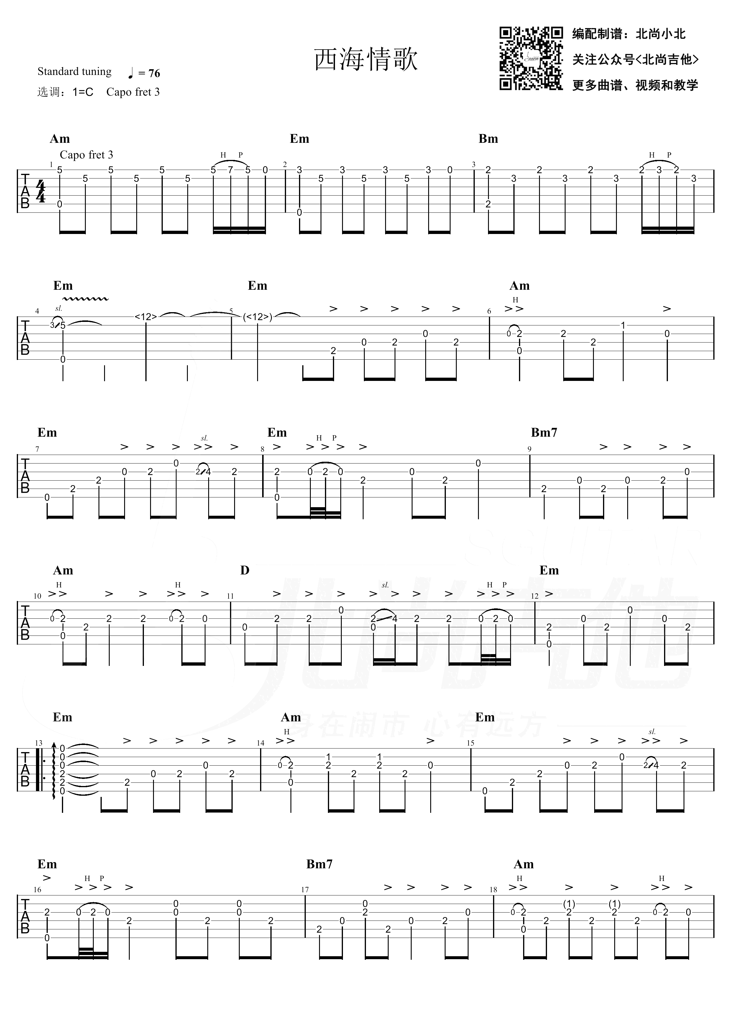 曲谱介绍: 吉他谱介绍:西海情歌指弹吉他谱,刀郎的一首指弹吉他曲目,这首曲子采用的是标准调弦,4/4拍的节奏,无需特殊调音。演奏时建议夹变调夹3品,也可根据个人实际情况选择。曲谱由琴谱网更新上传,共2张高清图片指弹吉他谱例,来源于@北尚吉他编配出品。这首歌回归了刀郎原有的对于民族音乐的追求,这种思考并不是从歌曲的音乐元素中所显示的不同地域的民族音乐风格。 西海情歌指弹吉他教学