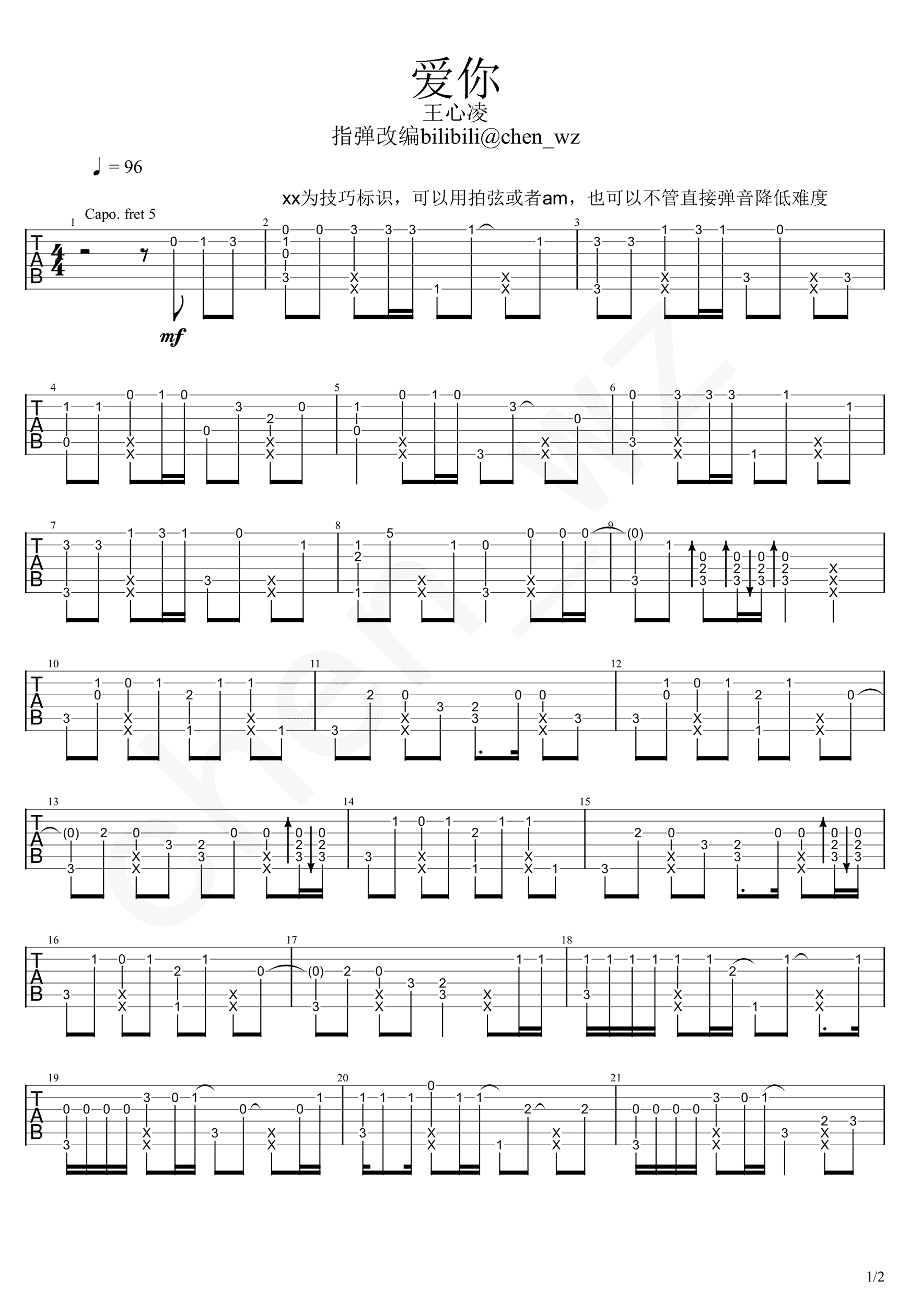 曲谱介绍: 吉他谱介绍:爱你指弹吉他谱,王心凌的一首指弹吉他曲目,这首曲子采用的是标准调弦,4/4拍的节奏,无需特殊调音。演奏时建议夹变调夹5品,也可根据个人实际情况选择。曲谱由琴谱网更新上传,共2张高清图片指弹吉他谱例,来源于@Chen_wz编配出品。 爱你指弹吉他教学