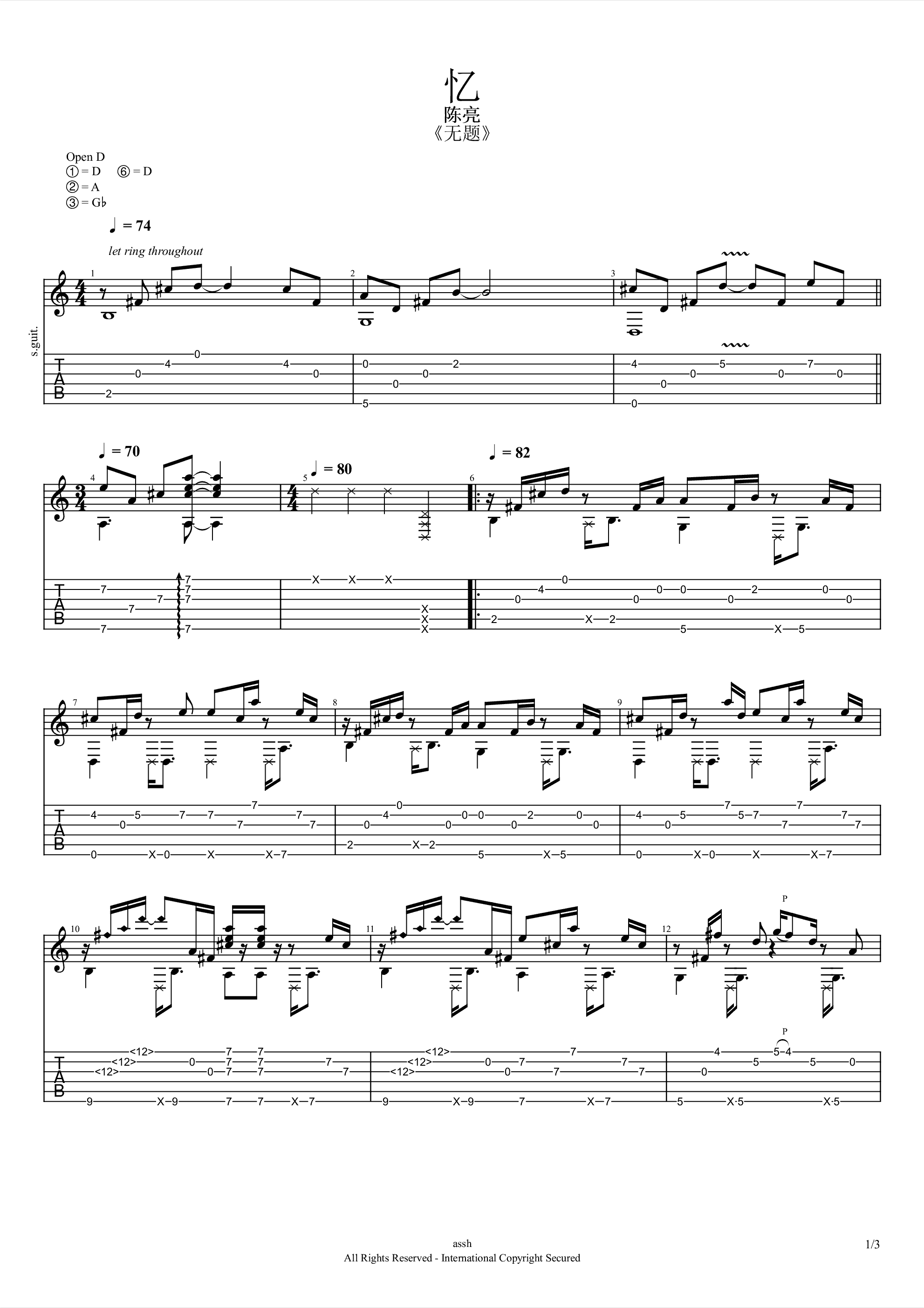 曲谱介绍: 吉他谱介绍:忆指弹吉他谱,陈亮的一首指弹吉他曲目,这首曲子采用的是特殊调弦,4/4拍的节奏,练习之前6根琴弦需要调到对应的音,曲谱上有标注,注意调音过程中不要断弦。小技巧:琴弦振动过程中不要调音,用手制音之后再旋转弦钮,会大大降低断弦的几率。演奏时可不夹变调夹,曲谱由琴谱网更新上传,共3张高清图片指弹吉他谱例,曲谱来源于网络转载,编配制谱者暂不详。此版本的曲谱是从陈亮老师的专辑中搜集而来的专辑原版曲谱,可能和我们看到一些版本会不一样。