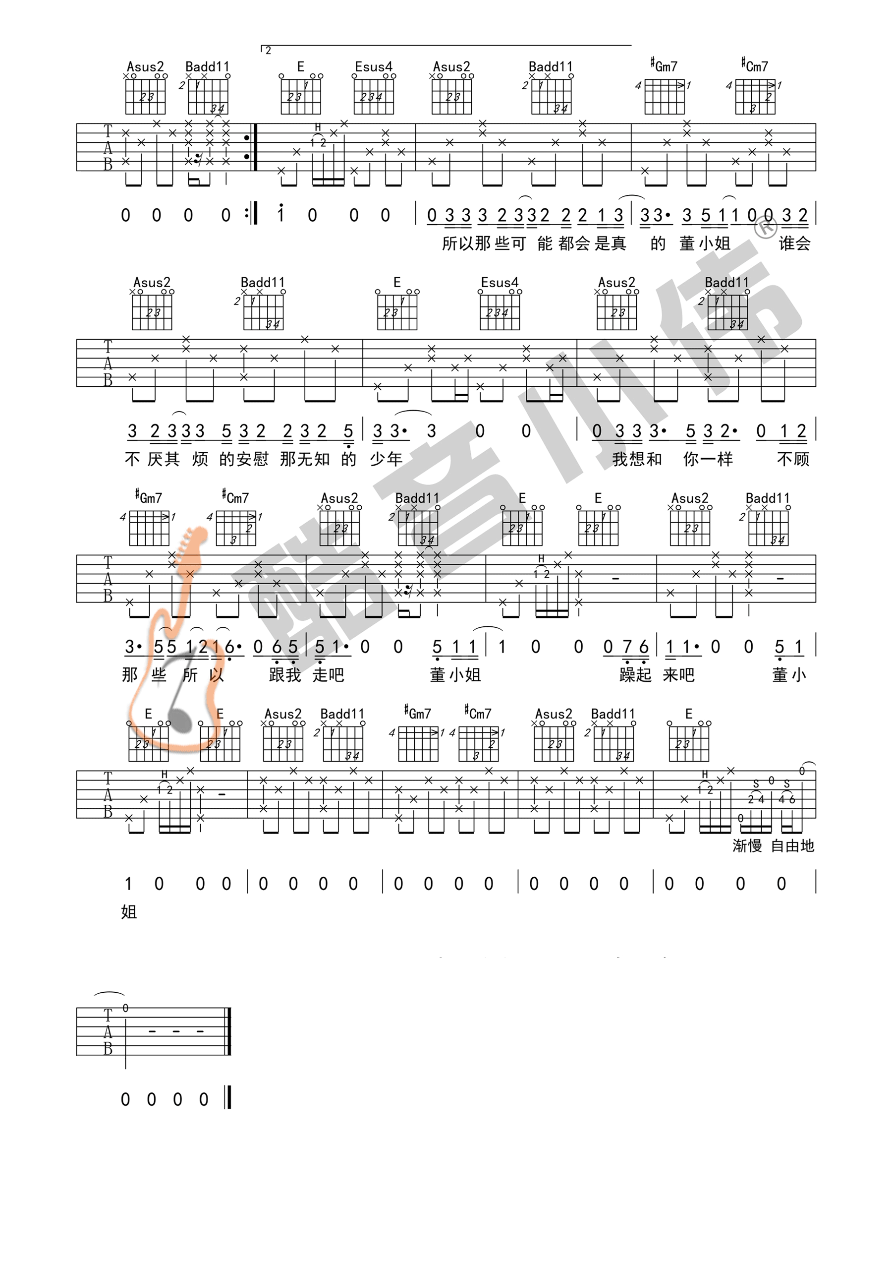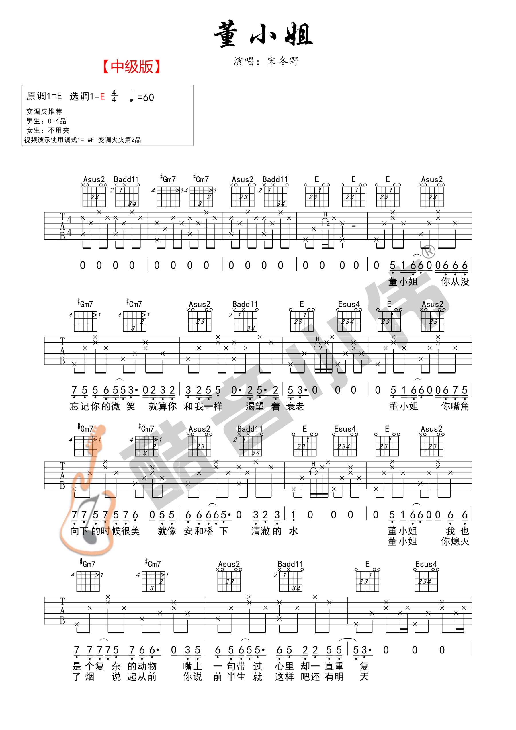 曲谱介绍: 吉他谱介绍:董小姐吉他谱,宋冬野演唱的一首歌曲,4/4拍的节奏,这首歌曲的原调为E调,这里曲谱采用了E调指法进行编配,演唱时可不夹变调夹,曲谱由琴谱网更新上传,共3张高清图片弹唱吉他谱例,来源于@酷音小伟编配出品。这是一首来自宋冬野非常有名的民谣歌曲,原版E调版本的指法比较难度,这个版本的谱子是按原版进行编配,所以在练习时会需要花更多时间,不懂的地方可以参考教学视频来练习。 董小姐吉他弹唱教学