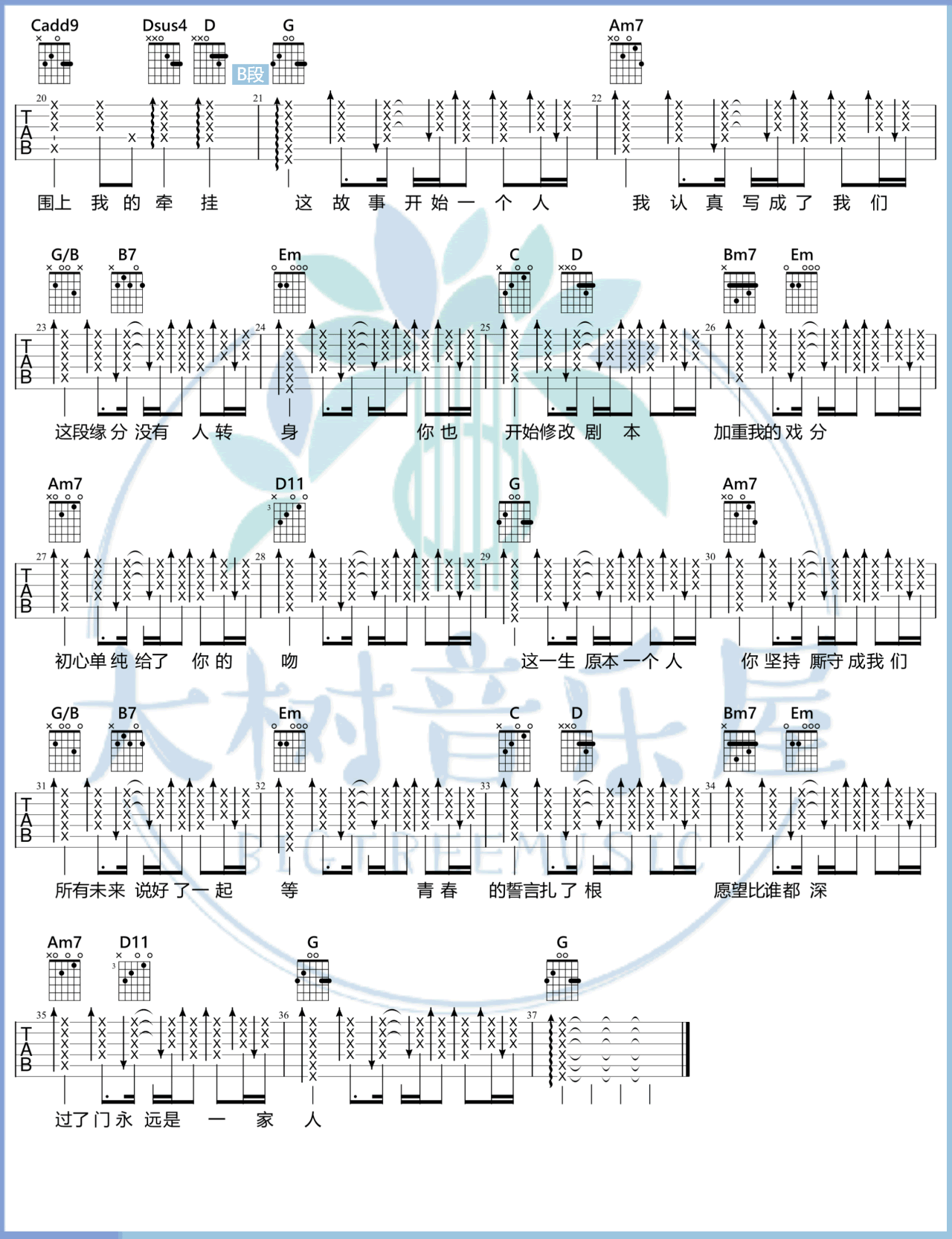 曲谱介绍: 吉他谱介绍:将故事写成我们吉他谱,林俊杰演唱的一首歌曲,4/4拍的节奏,这首歌曲的原调为降A调,这里曲谱采用了G调指法进行编配,演唱时夹变调夹1品可回到原调,也可根据个人实际嗓音情况选择。曲谱由琴谱网更新上传,共2张高清图片弹唱吉他谱例,来源于@大树音乐屋编配出品。令人熟悉的林俊杰式曲风,编曲上还带有一点中国风的味道。这个版本的吉他谱,有些难度,涉及到一些高把位的指法,练习过程中有不明白的地方,可以看一下教学视频。 将故事写成我们吉他弹唱教学