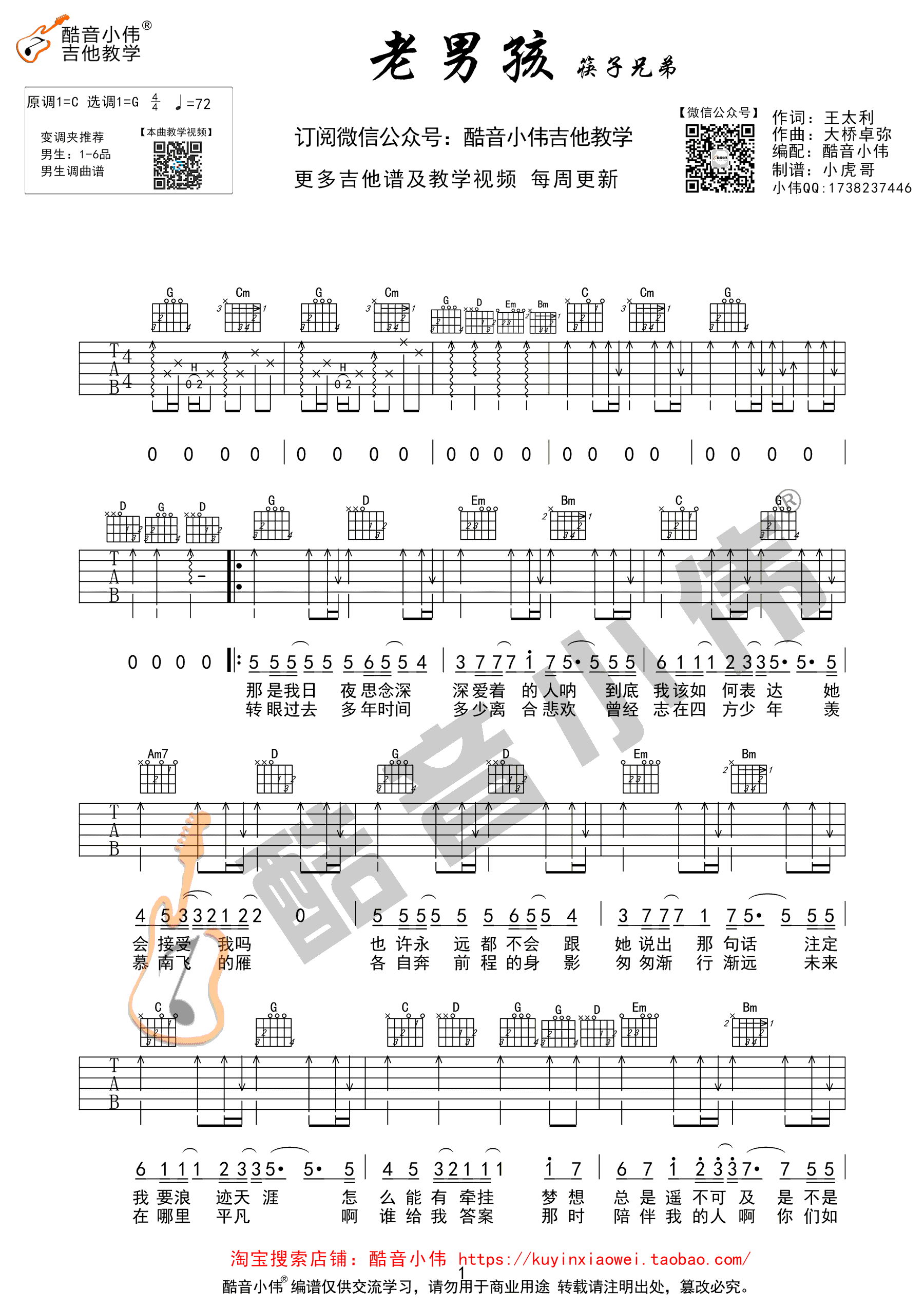曲谱介绍: 吉他谱介绍:老男孩吉他谱,筷子兄弟演唱的一首歌曲,4/4拍的节奏,这首歌曲的原调为C调,这里曲谱采用了G调指法进行编配,演唱时夹变调夹5品可回到原调,也可根据个人实际嗓音情况选择。曲谱由琴谱网更新上传,共3张高清图片弹唱吉他谱例,来源于@酷音小伟编配出品。这个版本为G调的吉他谱,难度其实和C调差不太多,主要区别在于,这个版本的伴奏,会让演唱者唱起来更舒服,因为原版C调的音太高,G调的话,可以随意调整成自己唱的最舒服的一个调。 老男孩吉他弹唱教学