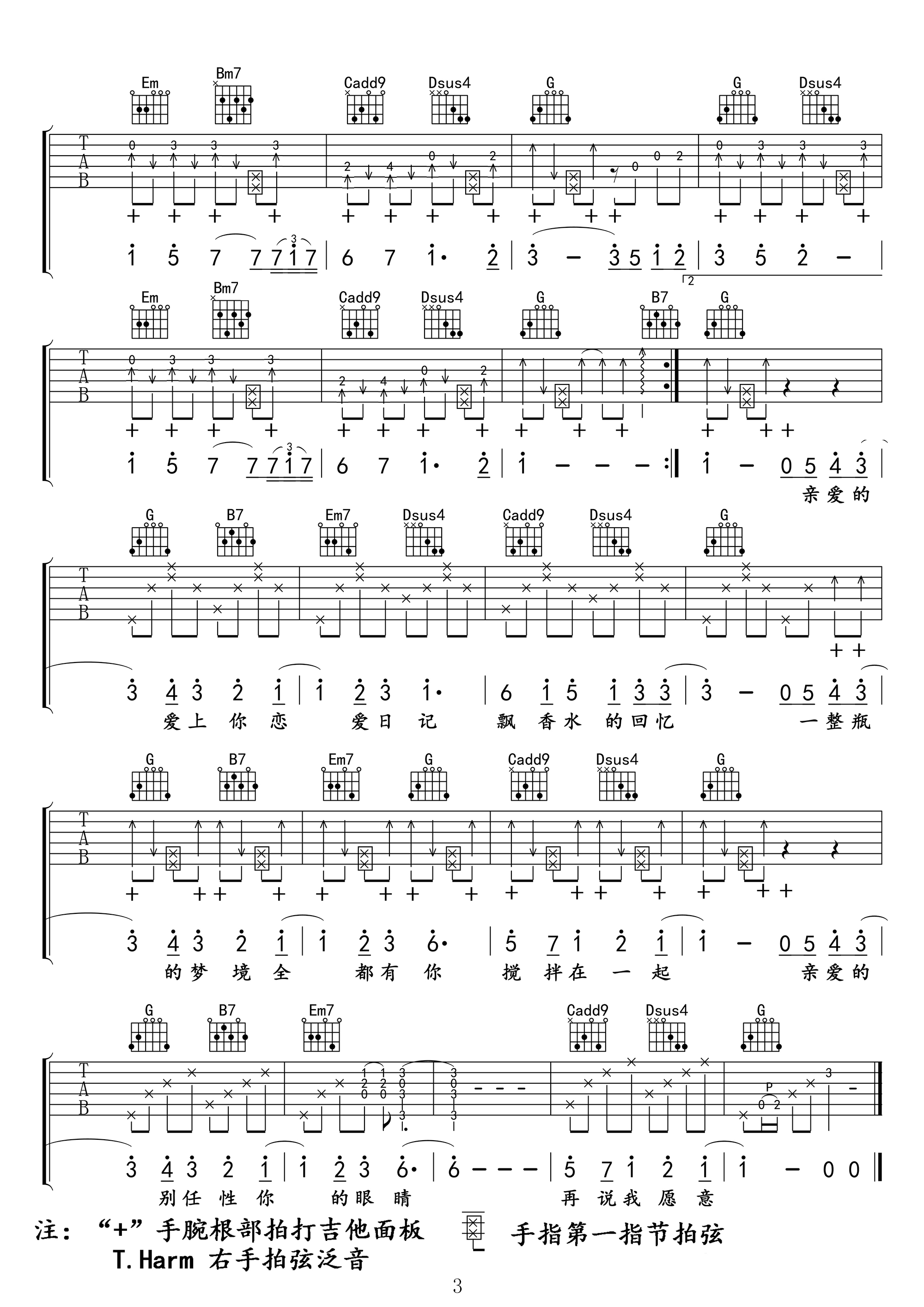 曲谱介绍: 吉他谱介绍:告白气球吉他谱,周杰伦演唱的一首歌曲,4/4拍的节奏,这首歌曲的原调为B调,这里曲谱采用了G调指法进行编配,演唱时夹变调夹4品可回到原调,也可根据个人实际嗓音情况选择。曲谱由琴谱网更新上传,共3张高清图片弹唱吉他谱例,来源于@福艺吉他编配出品。这首浪漫的情歌实在是甜到酣,非常适合用来表白的一首歌。这个版本的吉他谱为拍弦版,加入拍弦使得这首歌律动感更加强,指法难度也不大,练习要点主要在于拍弦技巧的掌握。 告白气球吉他弹唱教学
