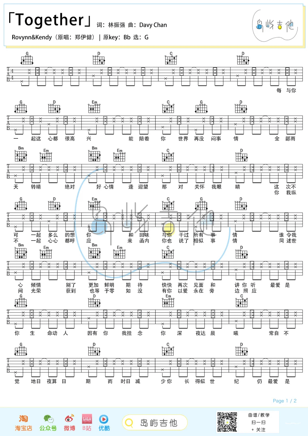 曲谱介绍: 吉他谱介绍:Together吉他谱,郑伊健演唱的一首歌曲,4/4拍的节奏,这首歌曲的原调为降B调,这里曲谱采用了G调指法进行编配,演唱时夹变调夹3品可回到原调,也可根据个人实际嗓音情况选择。曲谱由琴谱网更新上传,共3张高清图片弹唱吉他谱例,来源于@岛屿吉他编配出品。这是一首私藏的宝藏老歌,歌词言简意赅,旋律优美,以轻松愉快的心情道出纯纯的真爱,十分能够打动人的一首歌,这首歌可以循环好久好久。 Together吉他弹唱教学