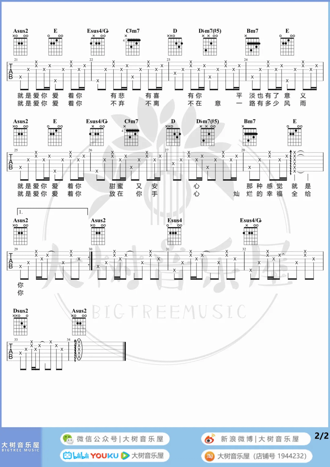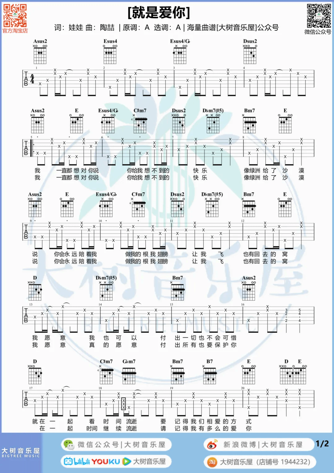 曲谱介绍: 吉他谱介绍:就是爱你吉他谱,陶喆演唱的一首歌曲,4/4拍的节奏,这首歌曲的原调为A调,这里曲谱采用了A调指法进行编配,演唱时可不夹变调夹,曲谱由琴谱网更新上传,共3张高清图片弹唱吉他谱例,来源于@大树音乐屋编配出品。这是陶喆演唱的一首经典R&B情歌,这个版本的吉他谱编配还原度比较高,横按比较多,另外制音技巧是这个版本最重要的技巧,需要多熟练一下。 就是爱你吉他弹唱教学