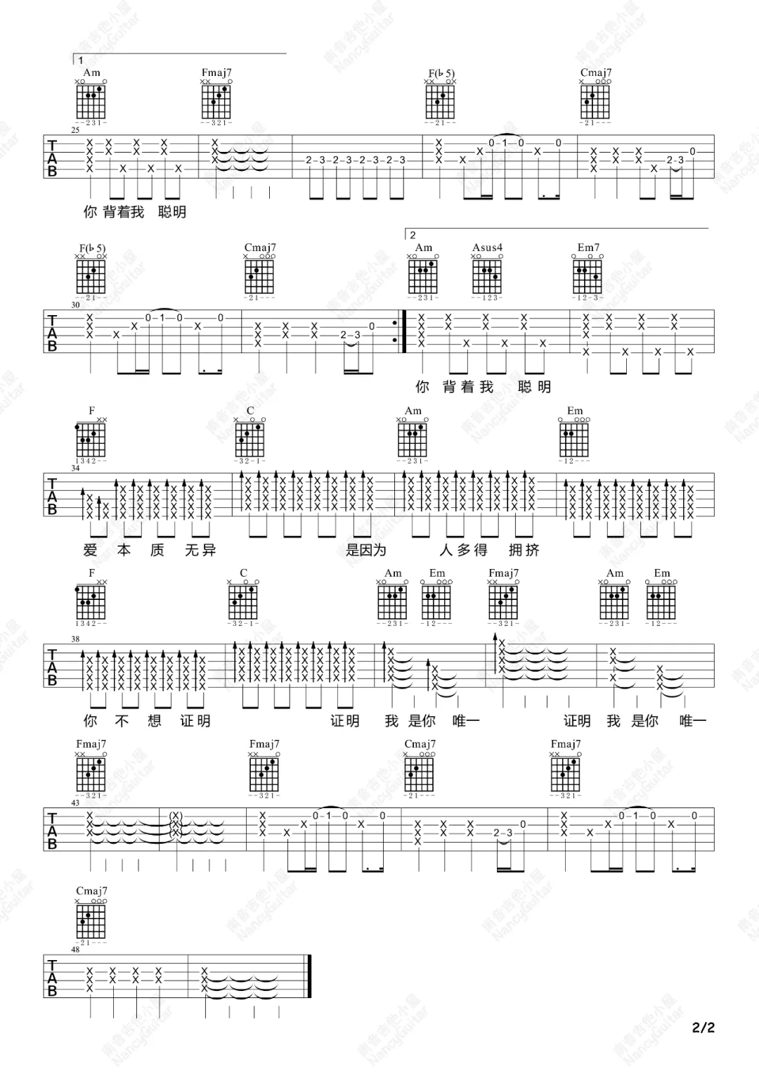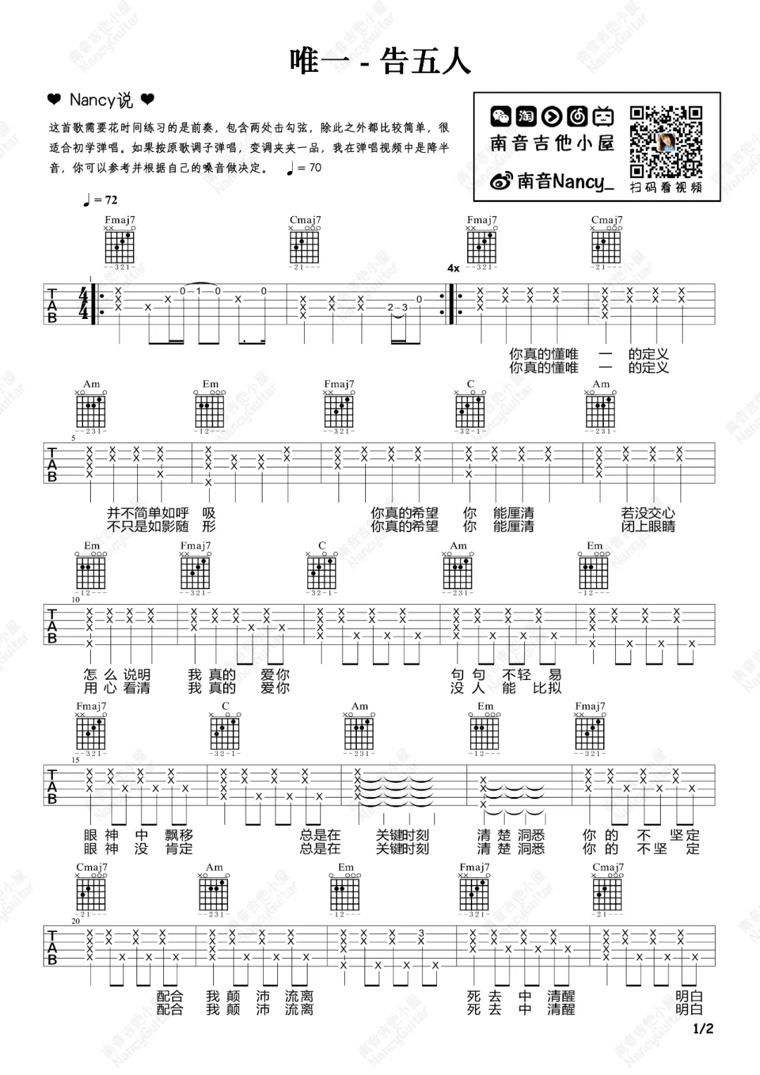曲谱介绍: 吉他谱介绍:唯一吉他谱,告五人演唱的一首歌曲,4/4拍的节奏,这首歌曲的原调为#C调,这里曲谱采用了C调指法进行编配,演唱时夹变调夹1品可回到原调,也可根据个人实际嗓音情况选择。曲谱由琴谱网更新上传,共2张高清图片弹唱吉他谱例,来源于@南音吉他编配出品。来自台湾的一支宝藏乐队“告五人”,他们的歌都非常写实,也很好听。 唯一吉他弹唱教学