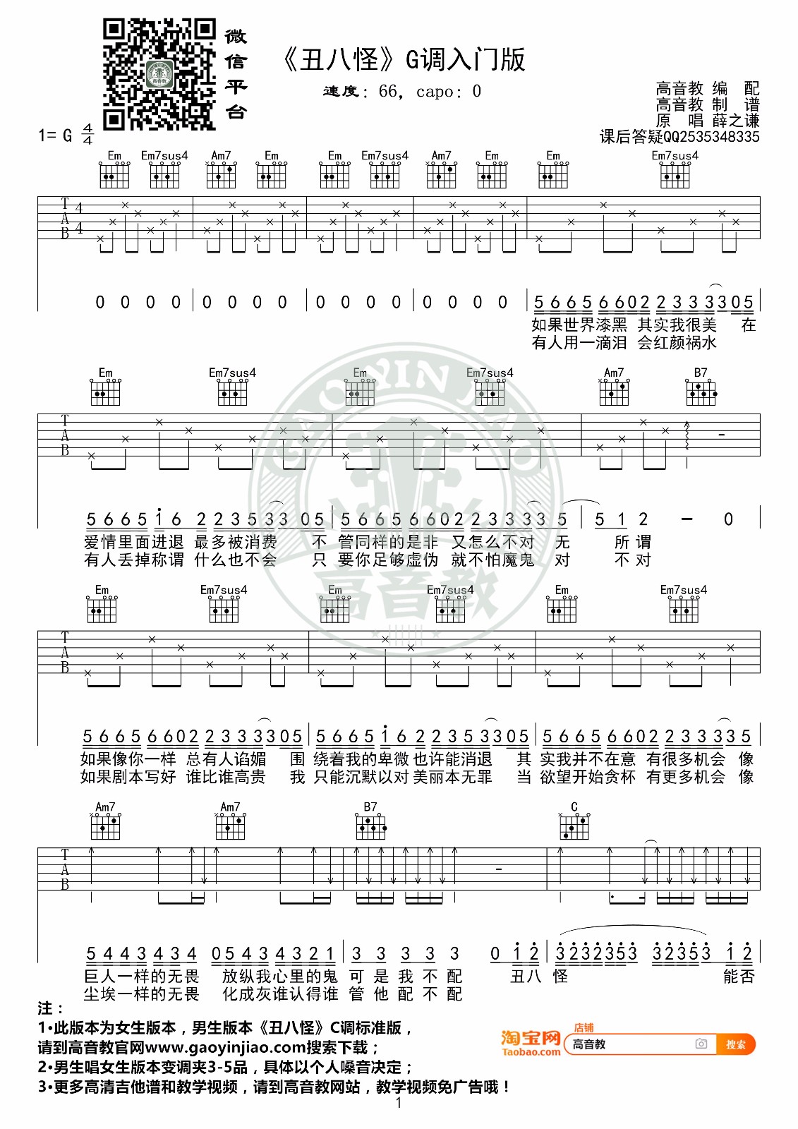 曲谱介绍: 吉他谱介绍:丑八怪吉他谱,薛之谦演唱的一首歌曲,4/4拍的节奏,这首歌曲的原调为#C调,这里曲谱采用了G调指法进行编配,演唱时可根据个人情况选择变调夹,曲谱由琴谱网更新上传,共2张高清图片弹唱吉他谱例,来源于@高音教编配出品。薛之谦的这首歌听着让人十分上头,有一种“感同身受”的感觉,这里的吉他谱为G调版本,比较简单,适合初学者练习。 丑八怪吉他弹唱教学