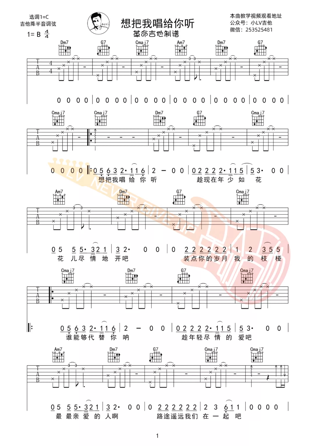 曲谱介绍: 吉他谱介绍:想把我唱给你听吉他谱,老狼演唱的一首歌曲,4/4拍的节奏,这首歌曲的原调为B调,这里曲谱采用了C调指法进行编配,演唱时降半音调弦可回到原调,也可根据个人实际嗓音情况选择不降音或夹几品。曲谱由琴谱网更新上传,共3张高清图片弹唱吉他谱例,来源于@革命吉他编配出品。这首经典的校园民谣歌曲,还有多少人记得呢,不管如何,这首歌在笔者心中确实一首百听不厌的歌曲。 想把我唱给你听吉他弹唱教学