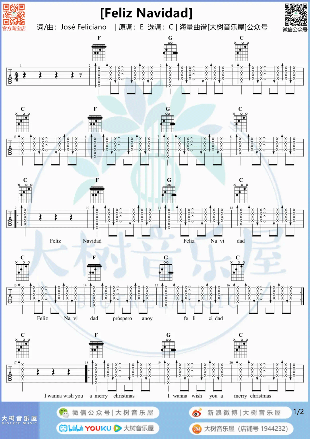 曲谱介绍: 吉他谱介绍:Feliz-Navidad吉他谱,4/4拍的节奏,这首歌曲的原调为E调,这里曲谱采用了C调指法进行编配,演唱时夹变调夹4品可回到原调,也可根据个人实际嗓音情况选择。曲谱由琴谱网更新上传,共3张高清图片弹唱吉他谱例,来源于@大树音乐屋编配出品。一首很经典的圣诞歌曲,最近马上到圣诞节了,可以练习下这首歌,有些难度哦。 Feliz-Navidad吉他弹唱教学
