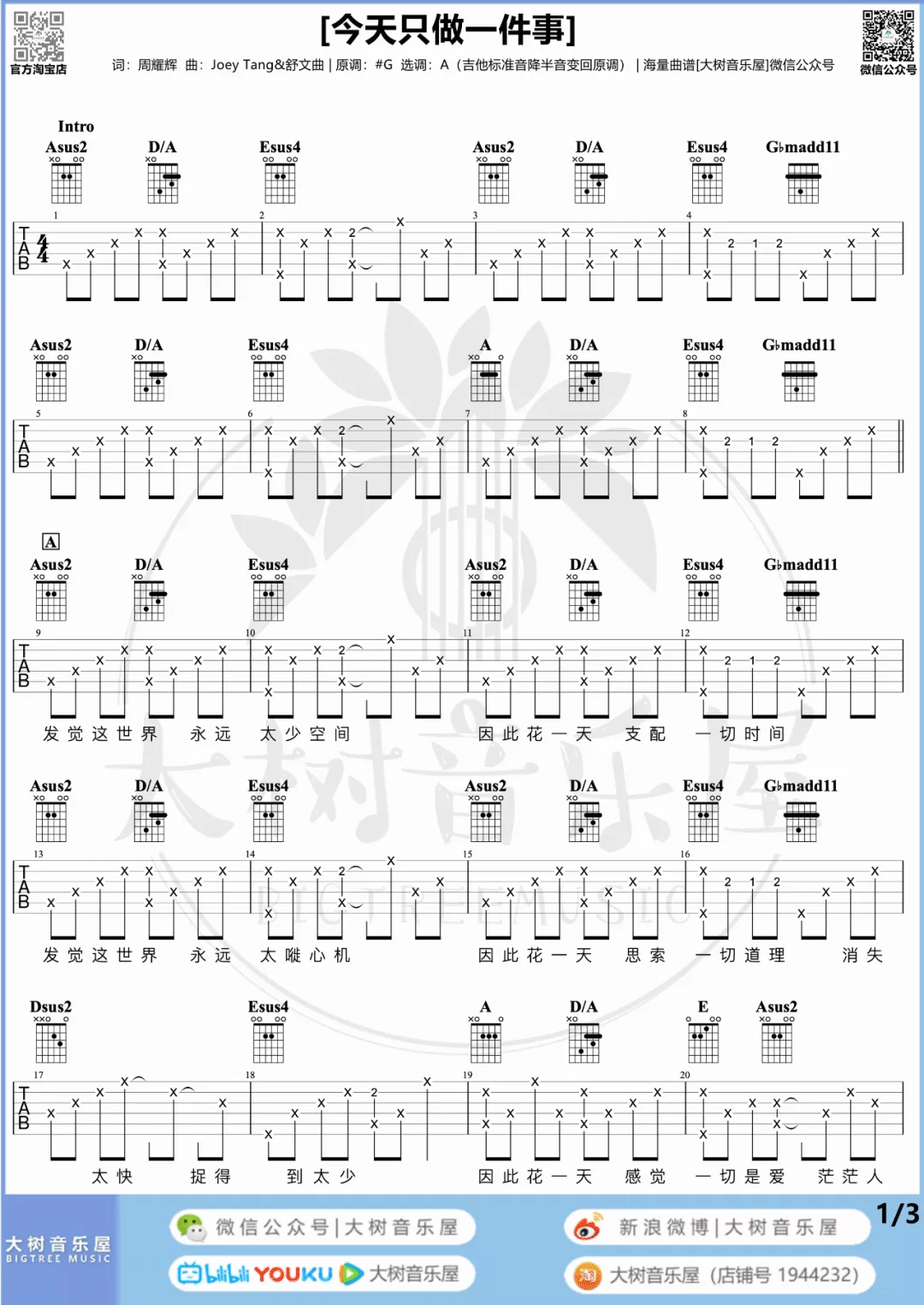 曲谱介绍: 吉他谱介绍:今天只做一件事吉他谱,陈奕迅演唱的一首歌曲,4/4拍的节奏,这首歌曲的原调为降A调,这里曲谱采用了A调指法进行编配,演唱时降半音调弦可回到原调,也可根据个人实际嗓音情况选择不降音或夹几品。曲谱由琴谱网更新上传,共3张高清图片弹唱吉他谱例,来源于@大树音乐屋编配出品。说实话算是我孤陋寡闻了,在这之前确实没听说过这首歌,不过去听了一下,挺不错的一首歌曲。 今天只做一件事吉他弹唱教学
