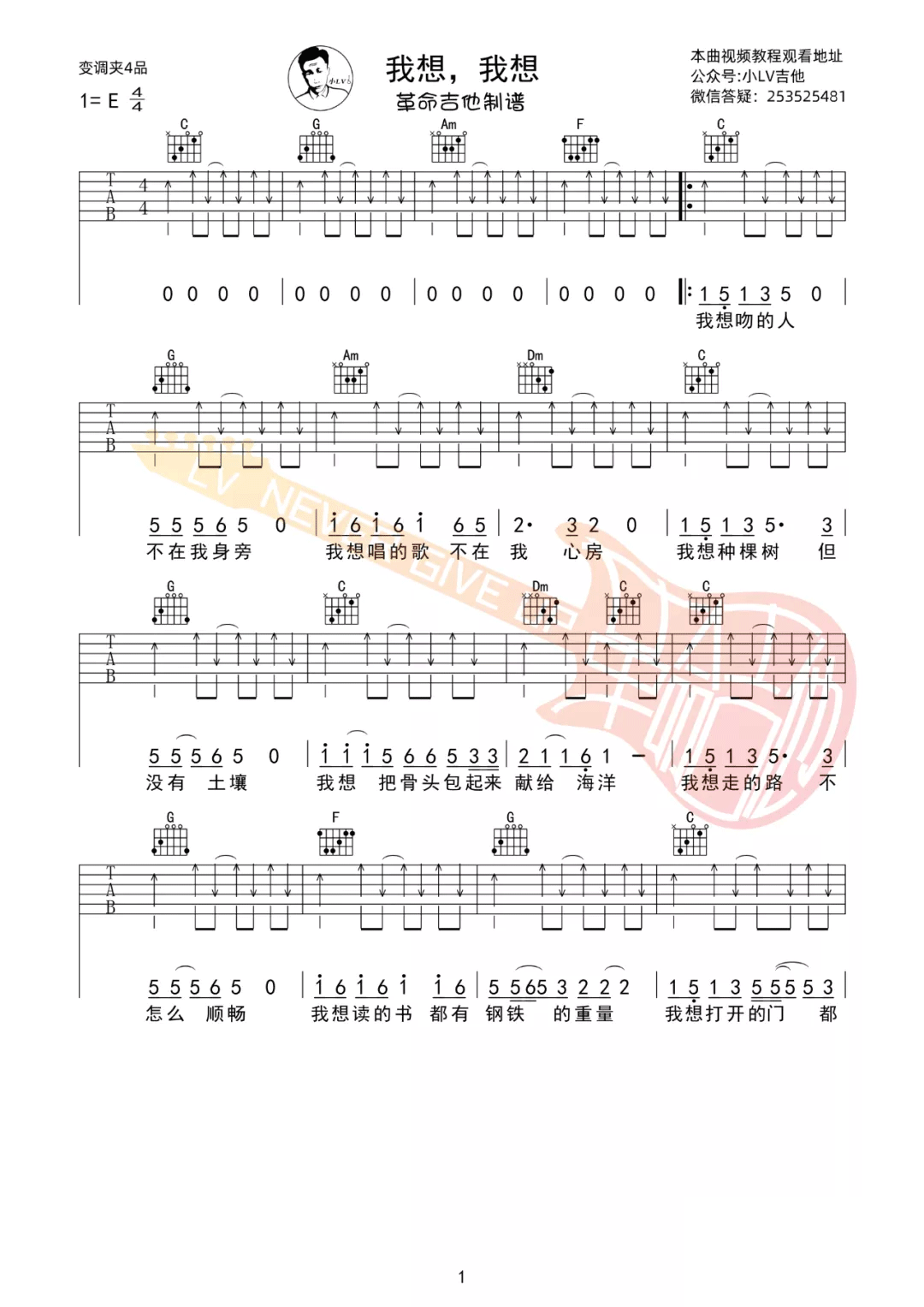曲谱介绍: 吉他谱介绍:我想我想吉他谱,洪启演唱的一首歌曲,4/4拍的节奏,这首歌曲的原调为E调,这里曲谱采用了C调指法进行编配,演唱时夹变调夹4品可回到原调,也可根据个人实际嗓音情况选择。曲谱由琴谱网更新上传,共3张高清图片弹唱吉他谱例,来源于@革命吉他编配出品。这是一首来自洪启创作的民谣歌曲,洪启联合民谣、摇滚圈诸多干将马条、艾尔肯、张楚、杨嘉松、钟立风共同演唱。 我想我想吉他弹唱教学