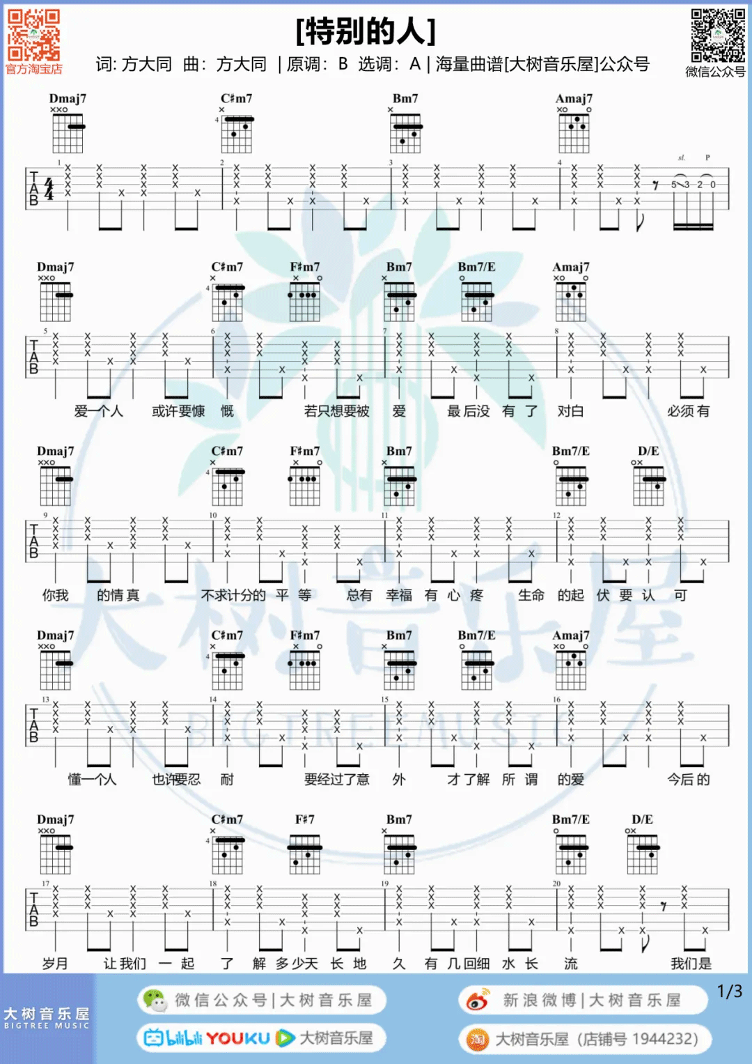 曲谱介绍: 吉他谱介绍:特别的人吉他谱,方大同演唱的一首歌曲,4/4拍的节奏,这首歌曲的原调为B调,这里曲谱采用了A调指法进行编配,演唱时夹变调夹2品可回到原调,也可根据个人实际嗓音情况选择。曲谱由琴谱网更新上传,共3张高清图片弹唱吉他谱例,来源于@大树音乐屋编配出品。一首方大同多年前的老歌,最近又火遍网络,看来“是金子总会发光”这句话确实是有道理的。 特别的人吉他弹唱教学