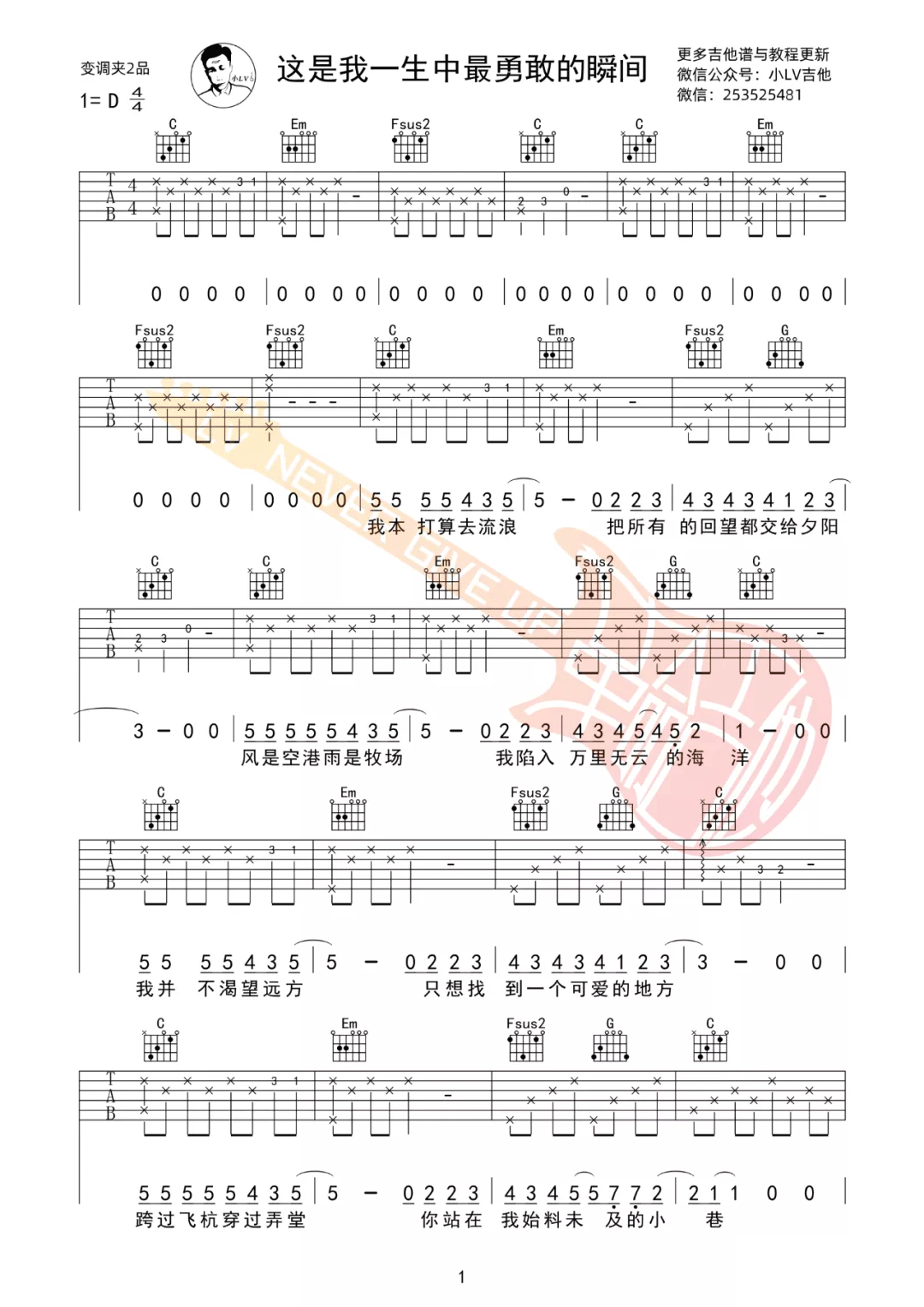 曲谱介绍: 吉他谱介绍:这是我一生中最勇敢的瞬间吉他谱,棱镜乐队演唱的一首歌曲,4/4拍的节奏,这首歌曲的原调为D调,这里曲谱采用了C调指法进行编配,演唱时夹变调夹2品可回到原调,也可根据个人实际嗓音情况选择。曲谱由琴谱网更新上传,共4张高清图片弹唱吉他谱例,来源于@革命吉他编配出品。这首歌的创作背景还比较浪漫,这首歌是根据一次现场女生的告白而创作出来的一首歌曲,旋律十分优美。 这是我一生中最勇敢的瞬间吉他弹唱教学