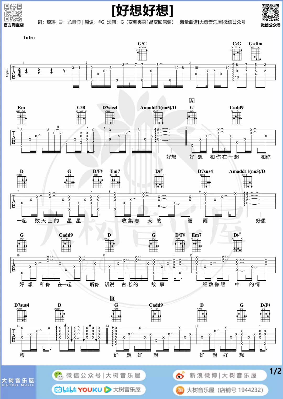 曲谱介绍: 吉他谱介绍:好想好想吉他谱,古巨基演唱的一首歌曲,4/4拍的节奏,这首歌曲的原调为降A调,这里曲谱采用了G调指法进行编配,演唱时夹变调夹1品可回到原调,也可根据个人实际嗓音情况选择。曲谱由琴谱网更新上传,共2张高清图片弹唱吉他谱例,来源于@大树音乐屋编配出品。这是一首回忆中的歌曲,这首歌也是当年火遍大江南北的电视剧《情深深雨濛濛》的插曲和片尾曲。 好想好想吉他弹唱教学