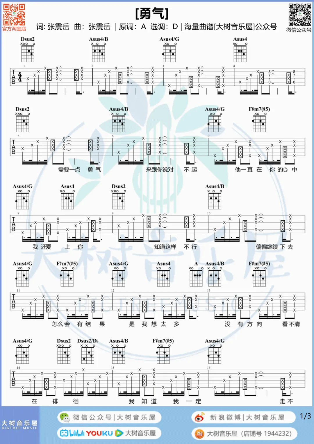 曲谱介绍: 吉他谱介绍:勇气吉他谱,夏日入侵企画演唱的一首歌曲,4/4拍的节奏,这首歌曲的原调为A调,这里曲谱采用了D调指法进行编配,演唱时可根据个人情况选择变调夹,曲谱由琴谱网更新上传,共3张高清图片弹唱吉他谱例,来源于@大树音乐屋编配出品。这首歌改编自张震岳的勇气,这首歌的节奏型比较复杂,和弦也不是比较常用的,想要练习的琴友可以跟着教学视频学习。 勇气吉他弹唱教学