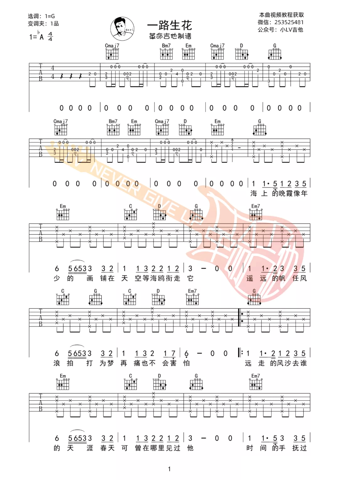 一路生花吉他谱 - 温奕心 - G调吉他弹唱谱 - 原版
