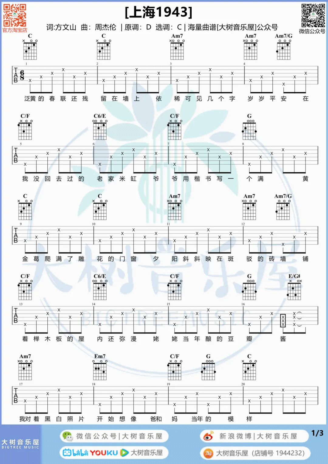 曲谱介绍: 吉他谱介绍:上海1943吉他谱,周杰伦演唱的一首歌曲,6/8拍的节奏,这首歌曲的原调为D调,这里曲谱采用了C调指法进行编配,演唱时夹变调夹2品可回到原调,也可根据个人实际嗓音情况选择。曲谱由琴谱网更新上传,共3张高清图片弹唱吉他谱例,来源于@大树音乐屋编配出品。一首很有深度的歌曲,比较难唱,这里的吉他谱编配整体难度不大,但有些细节需要注意,如拍弦制音等技巧,为这首歌的伴奏效果增色不少。 上海1943吉他弹唱教学