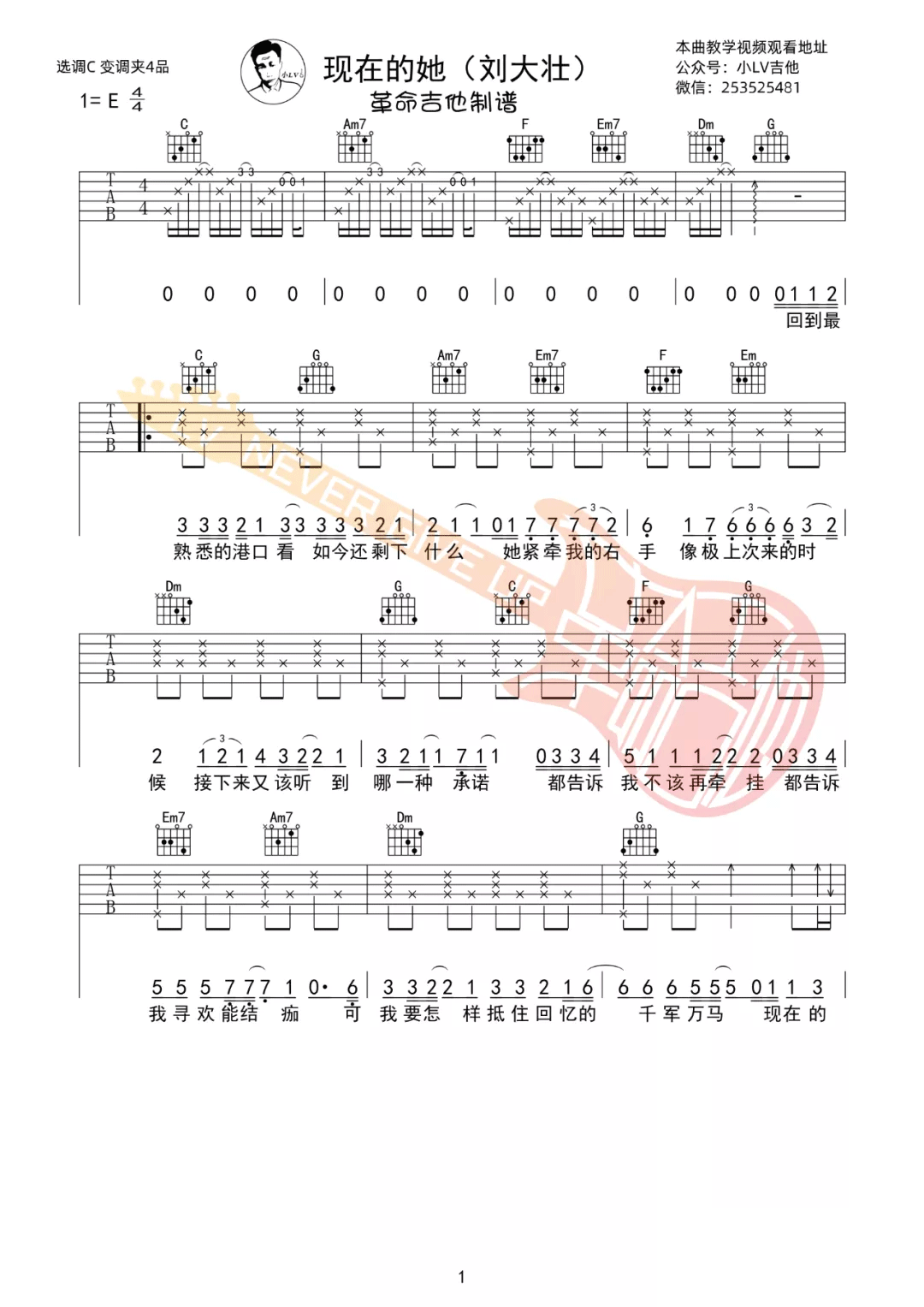 曲谱介绍: 吉他谱介绍:现在的她吉他谱,刘大壮演唱的一首歌曲,4/4拍的节奏,这首歌曲的原调为E调,这里曲谱采用了C调指法进行编配,演唱时夹变调夹4品可回到原调,也可根据个人实际嗓音情况选择。曲谱由琴谱网更新上传,共3张高清图片弹唱吉他谱例,来源于@革命吉他编配出品。刘大壮在1.15号发布的最新单曲,又一首情歌,动人心弦。 现在的她吉他弹唱教学