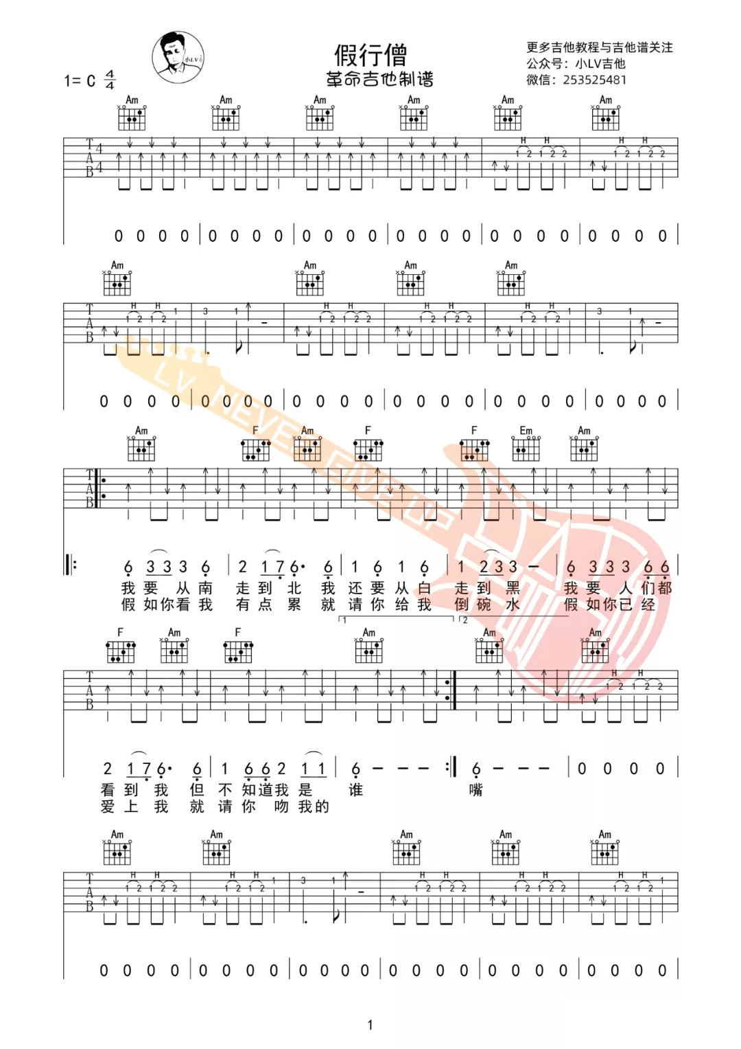 曲谱介绍: 吉他谱介绍:假行僧吉他谱,崔健演唱的一首歌曲,4/4拍的节奏,这首歌曲的原调为C调,这里曲谱采用了C调指法进行编配,演唱时可不夹变调夹,曲谱由琴谱网更新上传,共3张高清图片弹唱吉他谱例,来源于@革命吉他编配出品。一首来自崔健创作并演唱的经典摇滚歌曲,全扫弦编配,比较简单,喜欢的琴友可以练习一下,附上对应的吉他弹唱教学视频。 假行僧吉他弹唱教学