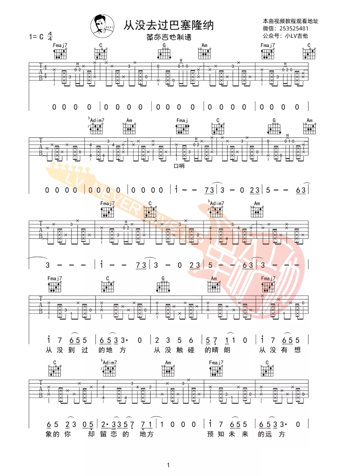 曲谱介绍: 吉他谱介绍:从没去过巴塞隆纳吉他谱,告五人演唱的一首歌曲,4/4拍的节奏,这首歌曲的原调为C调,这里曲谱采用了C调指法进行编配,演唱时可不夹变调夹,曲谱由琴谱网更新上传,共4张高清图片弹唱吉他谱例,来源于@革命吉他编配出品。 从没去过巴塞隆纳吉他弹唱教学