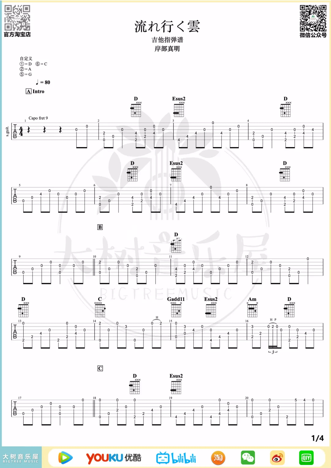 曲谱介绍: 吉他谱介绍:流行的云指弹吉他谱,岸部真明的一首指弹吉他曲目,这首曲子采用的是特殊调弦,4/4拍的节奏,练习之前6根琴弦需要调到对应的音,曲谱上有标注,注意调音过程中不要断弦。小技巧:琴弦振动过程中不要调音,用手制音之后再旋转弦钮,会大大降低断弦的几率。演奏时建议夹变调夹7品,也可根据个人实际情况选择。曲谱由琴谱网更新上传,共4张高清图片指弹吉他谱例,来源于@大树音乐屋编配出品。一首非常好听的日系指弹曲,指法非常简单,变调夹是需要夹9品和原曲调式相同,这里考虑到指法问题,可以夹低一些,比较好弹。 流行的云指弹吉他教学