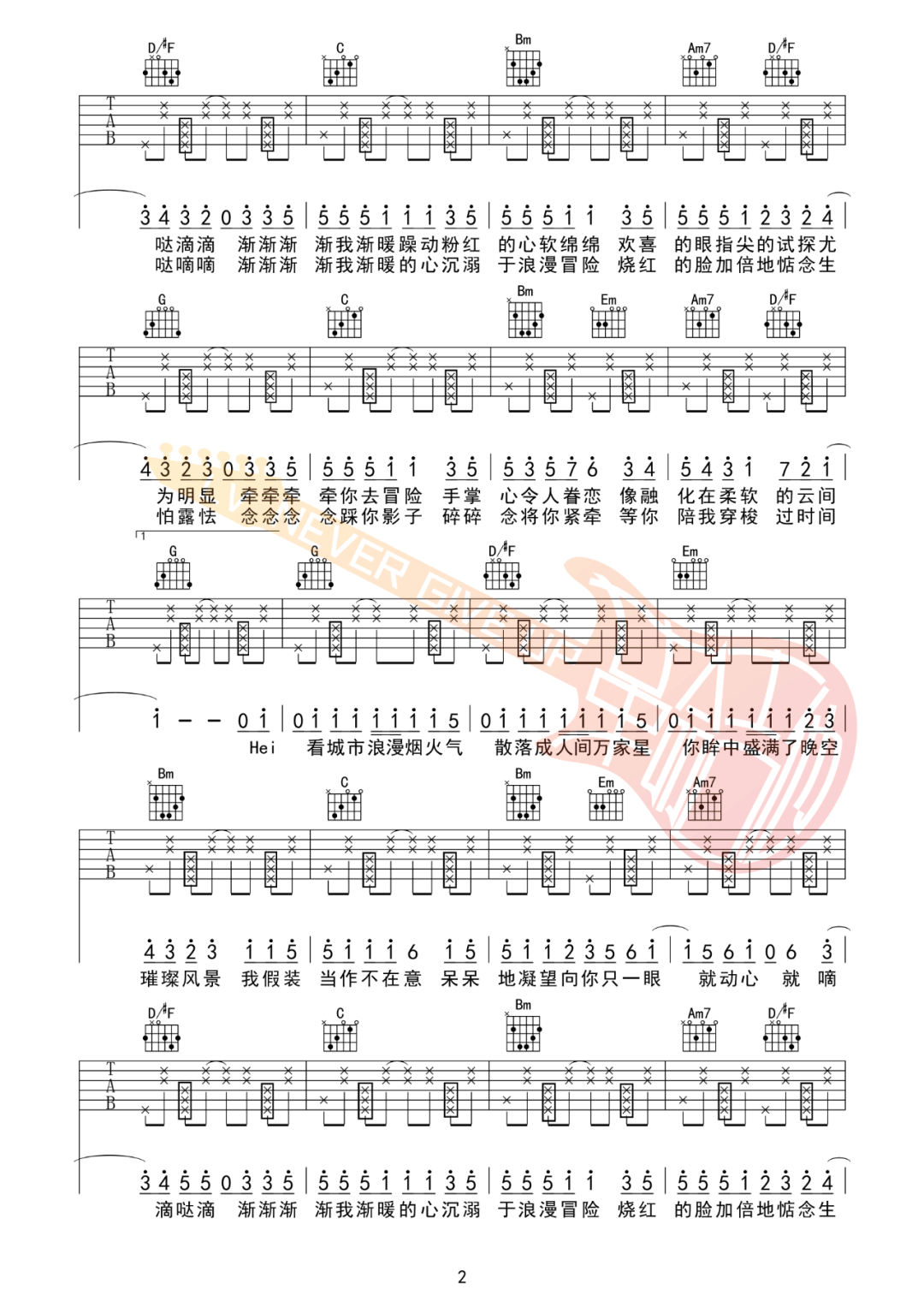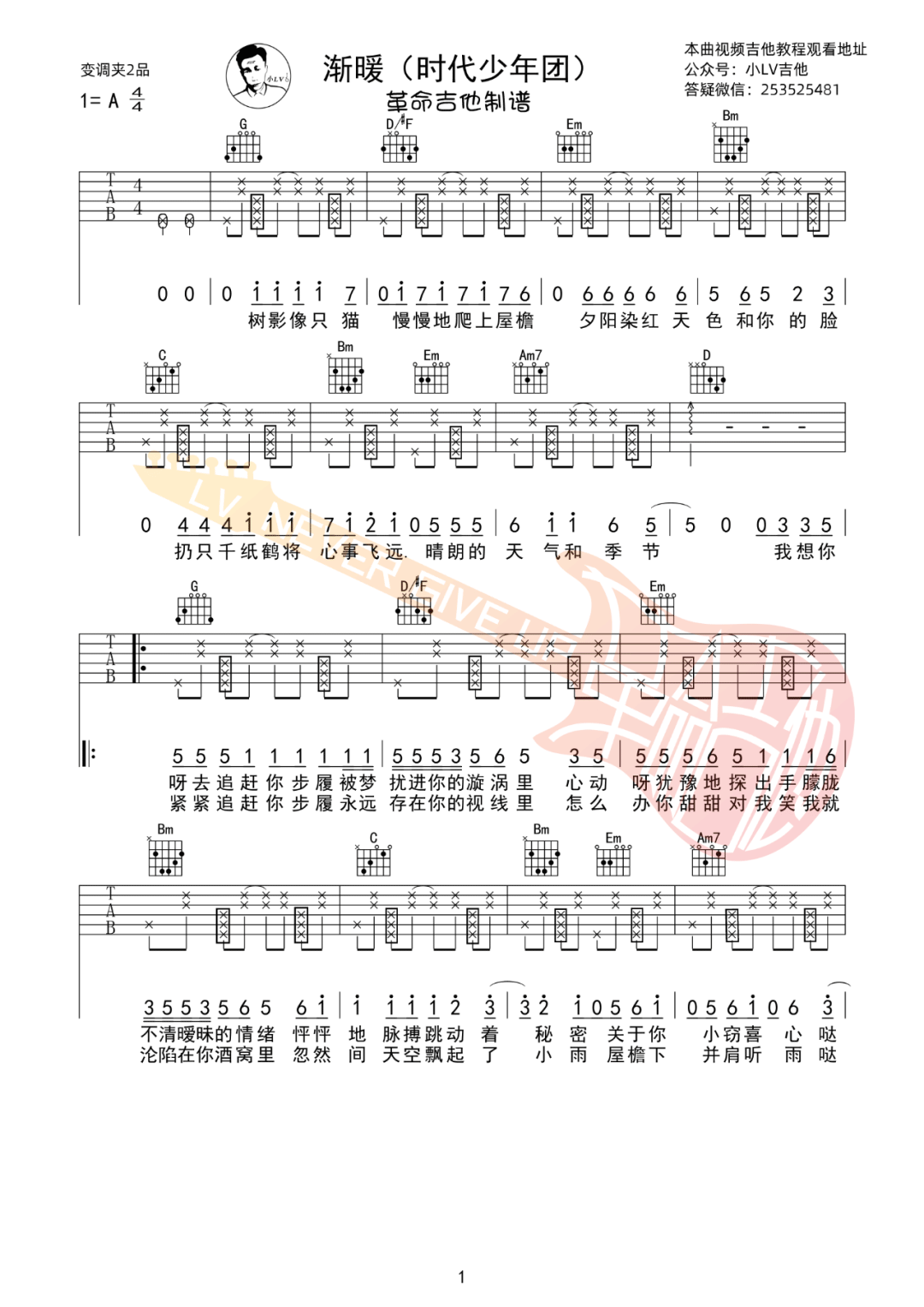 曲谱介绍: 吉他谱介绍:渐暖吉他谱,时代少年团演唱的一首歌曲,4/4拍的节奏,这首歌曲的原调为A调,这里曲谱采用了G调指法进行编配,演唱时夹变调夹2品可回到原调,也可根据个人实际嗓音情况选择。曲谱由琴谱网更新上传,共4张高清图片弹唱吉他谱例,来源于@革命吉他编配出品。这首歌是少年们送给粉丝的一份特别的礼物,少年的爱简单、纯粹,没有任何杂质。 渐暖吉他弹唱教学