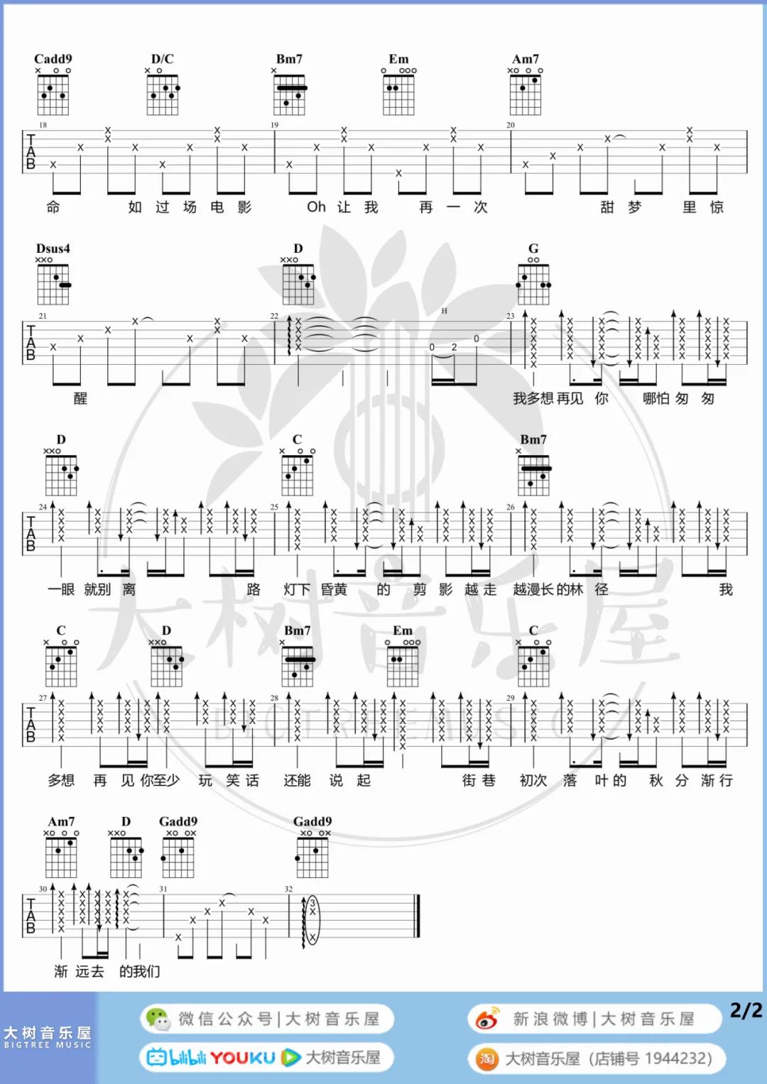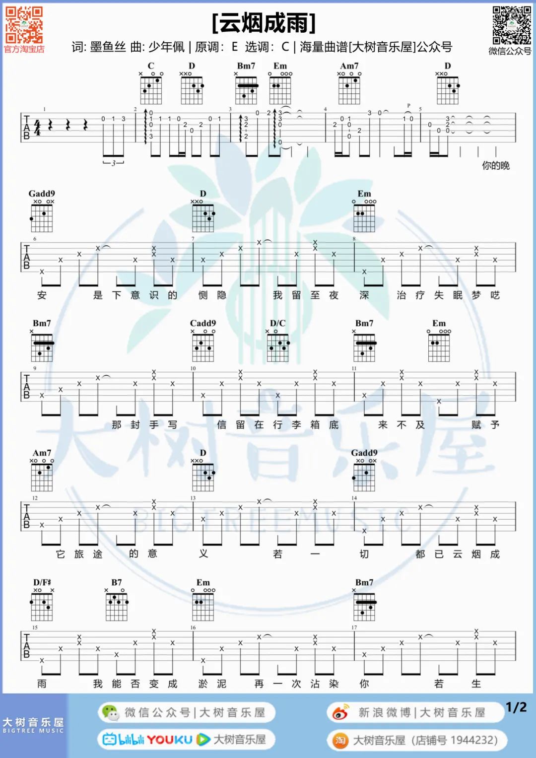 曲谱介绍: 吉他谱介绍:云烟成雨吉他谱,房东的猫演唱的一首歌曲,4/4拍的节奏,这首歌曲的原调为E调,这里曲谱采用了C调指法进行编配,演唱时夹变调夹4品可回到原调,也可根据个人实际嗓音情况选择。曲谱由琴谱网更新上传,共2张高清图片弹唱吉他谱例,来源于@大树音乐屋编配出品。一首好听的小清新民谣,房东的猫她们的歌曲都是这种风格,这首歌也是动画《我是江小白》的片尾曲。 云烟成雨吉他弹唱教学