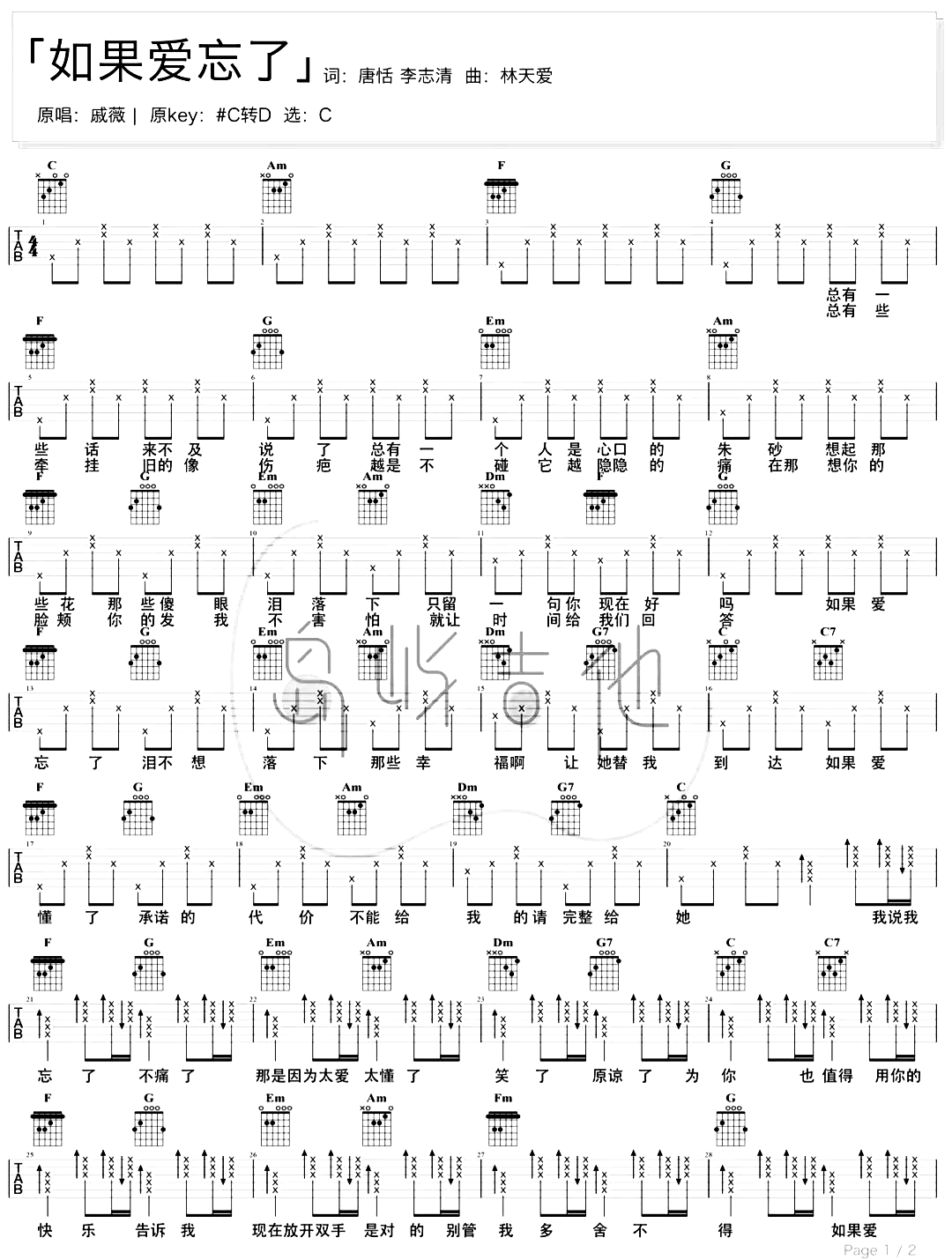 曲谱介绍: 如果爱忘了吉他谱,戚薇演唱的一首电视剧片尾曲,相信我们都还记得《爱情睡醒了》的满满画面,疗伤的旋律修补着心灵的空洞,如果爱忘了,有一天偶然相遇,能否还会想起曾几何时的那些零碎幸福? 《如果爱忘了》吉他弹唱谱,选用C调指法,原调#C转D调,共有两张图片谱,本谱难度较简单比较适合新手练习。