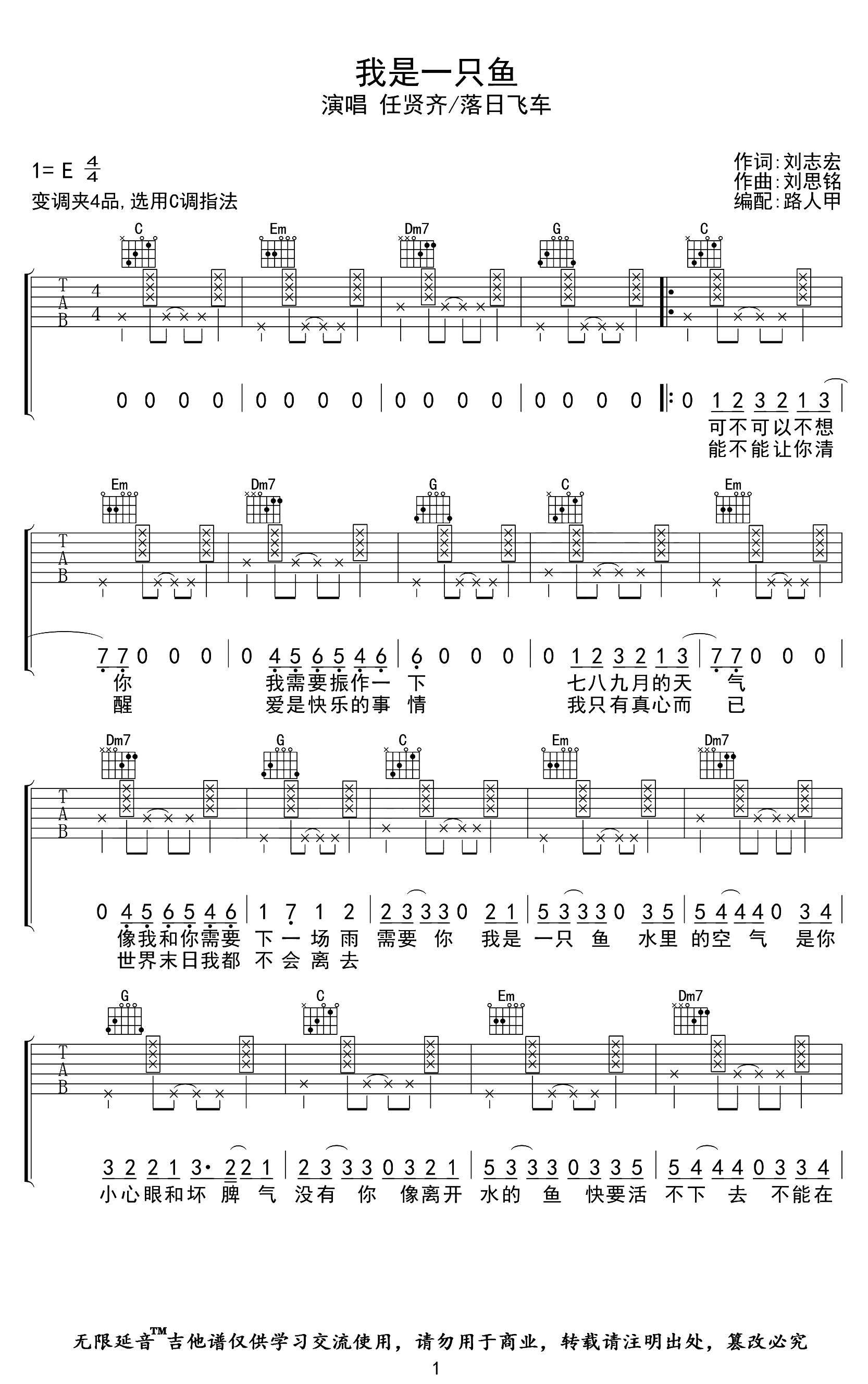 我是一只鱼吉他谱 - 任贤齐&落日飞车 - C调吉他弹唱谱
