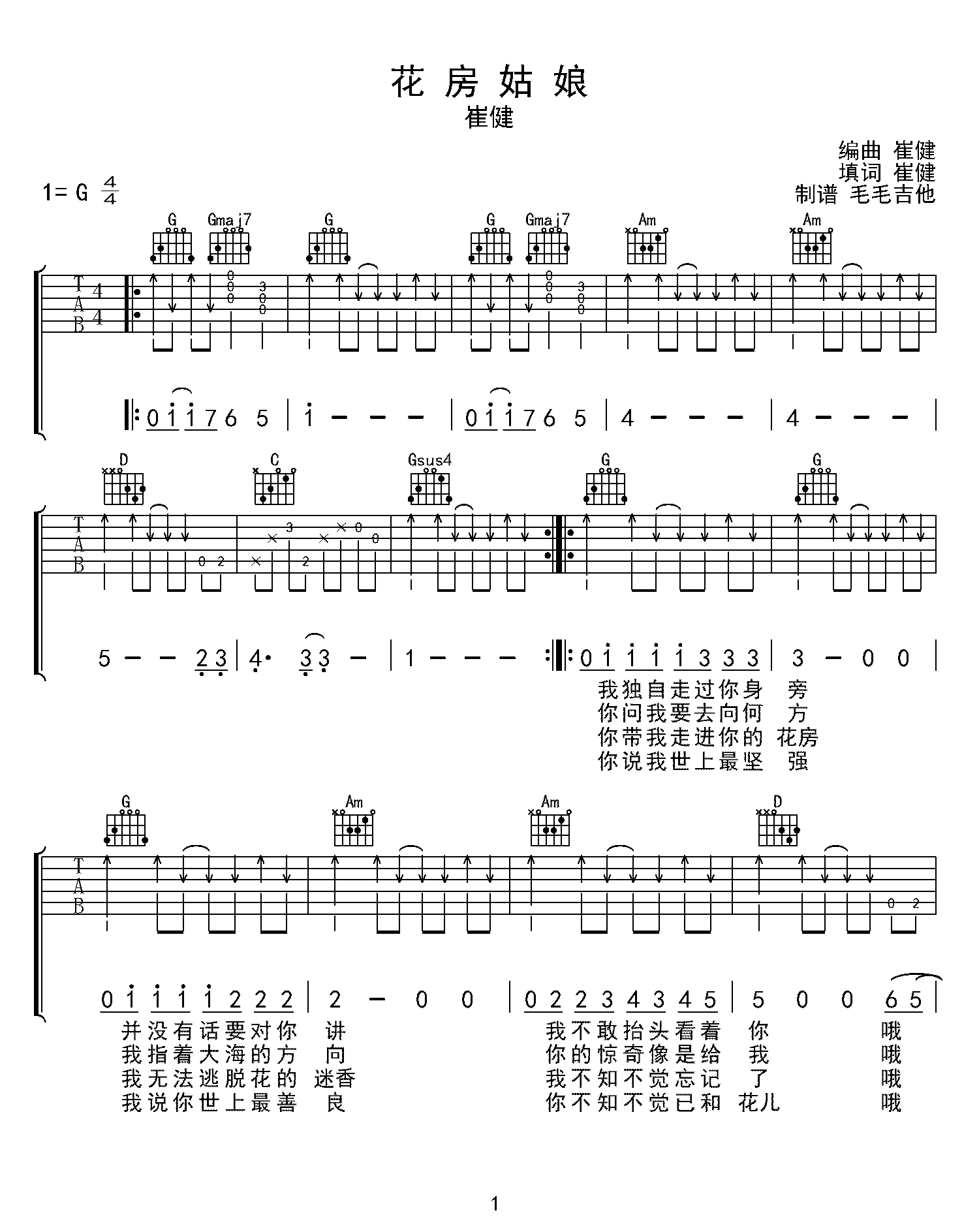 曲谱介绍: 崔健创作歌曲当中的一曲《花房姑娘》可以堪称非常难见的抒情经典之作,与他咆哮的歌曲相比,这首歌曲更温柔细腻。正是这种温柔揭示了20世纪80年代青春情感生活的冰山一角。 崔健《花房姑娘》吉他谱,选用G调指法,可根据自己嗓音条件调整变调夹位置,本谱共三张高清六线图谱,由@毛毛吉他制谱分享。