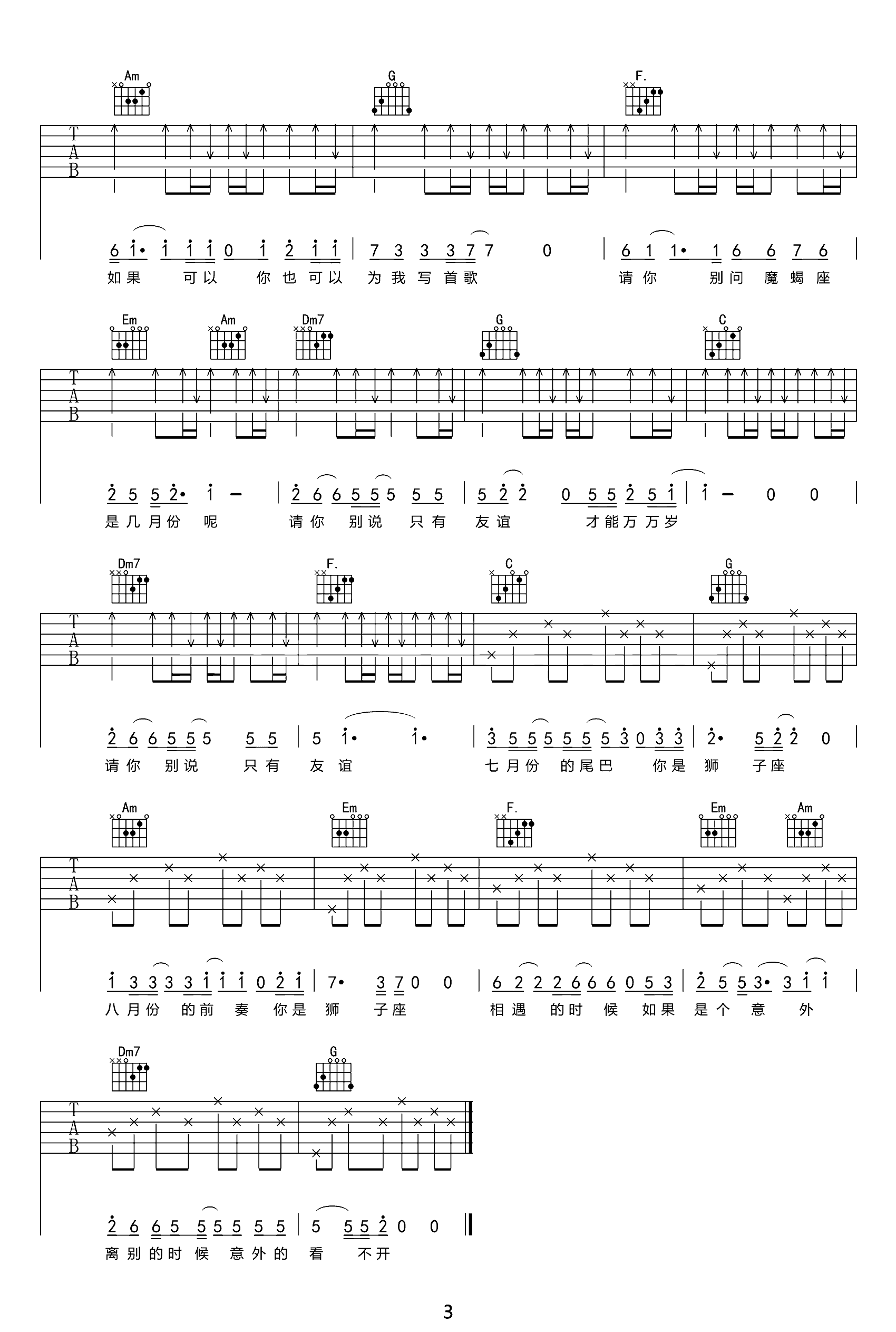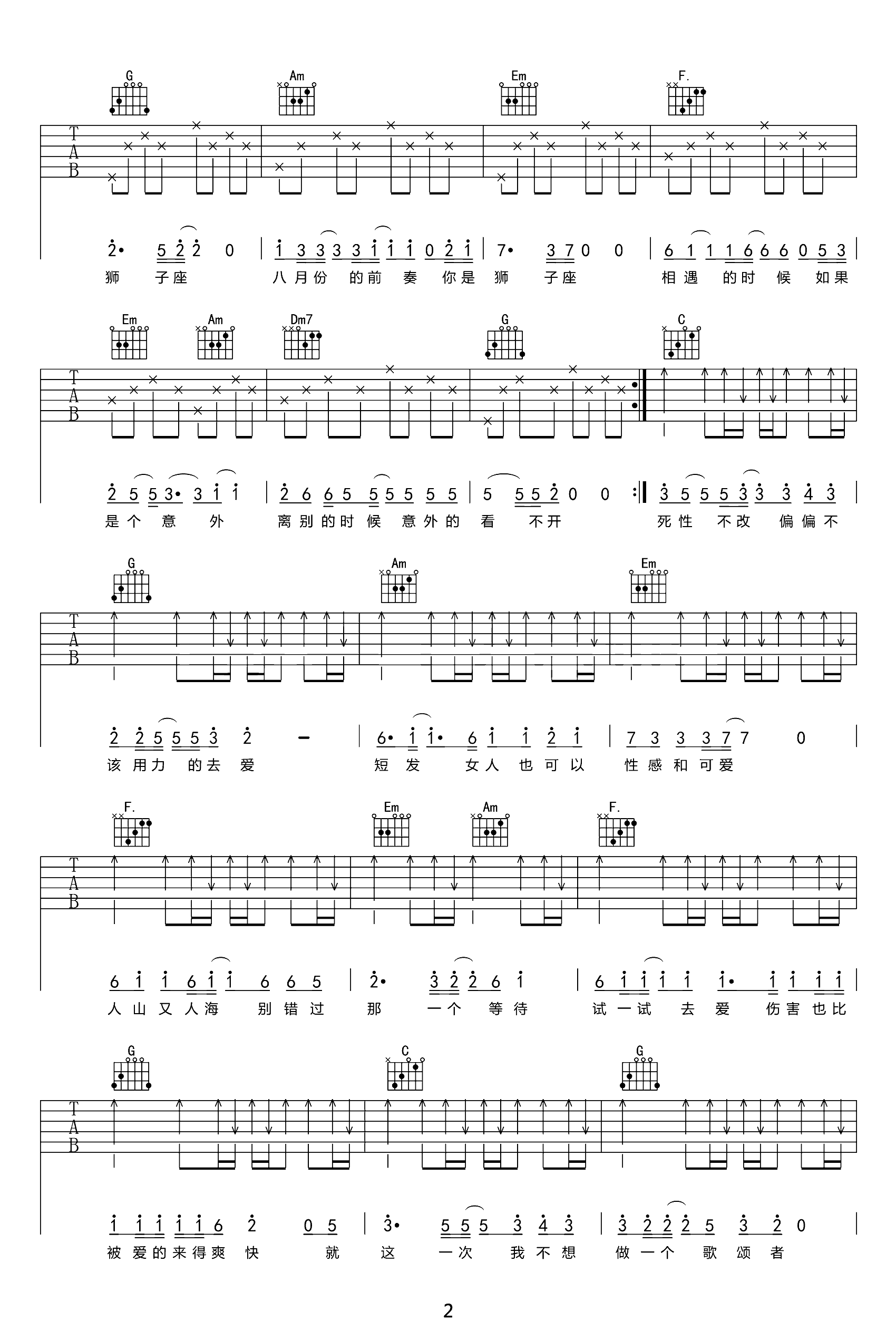 曲谱介绍: 狮子座吉他谱,超级女声曾轶可曾经原创演唱的一首曲目,慵懒的曲风让我们回到了那个夏天,喃喃细语更是将小女生的倔强与文艺娓娓道来,这首《狮子座》特别中有着它独特的魅力! 《狮子座》吉他弹唱谱,共三张高清六线谱,选用C调指法,原调bE,可将变调夹夹3品弹唱原调,包含前奏按原版编配,难度初级简单。