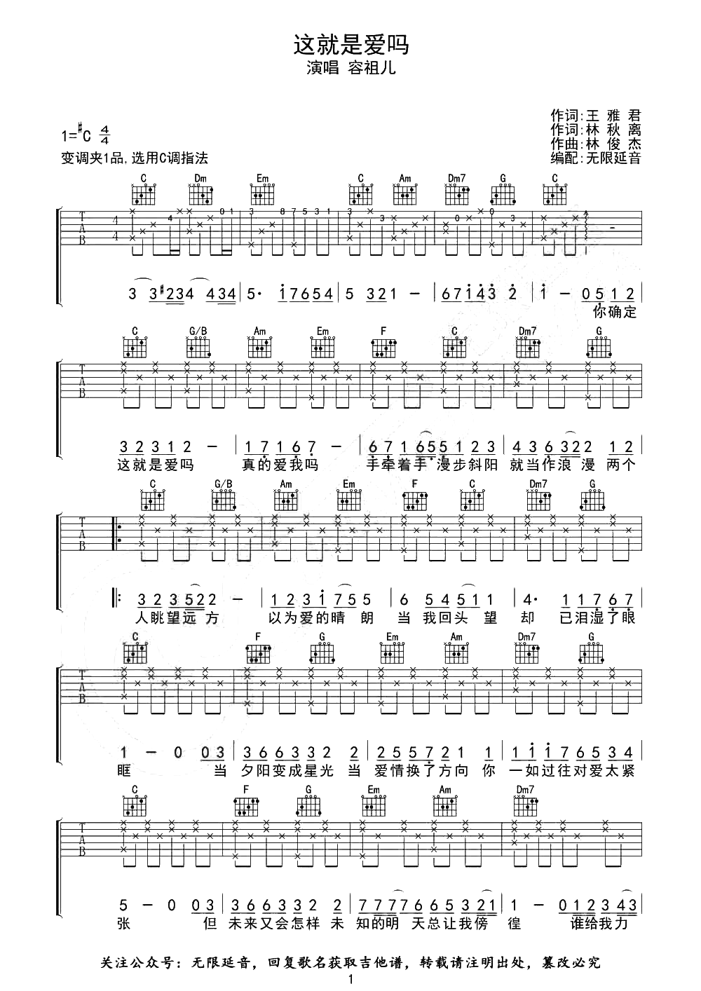 曲谱介绍: 容祖儿《这就是爱吗》吉他谱,她的歌声婉转细腻,扎实的唱功和充沛的情感相结合传递着我们每个人都能共鸣感知的情感,随着歌曲情感层层递进,情绪的起承转合自然流畅,在祖儿的歌声中,我们听到了犹疑彷徨,也看到了无畏力量。 《这就是爱吗》吉他六线谱,由无限延音编配,选用C调,原调#C,建议变调夹夹1品弹唱,弹唱难度初级简单。