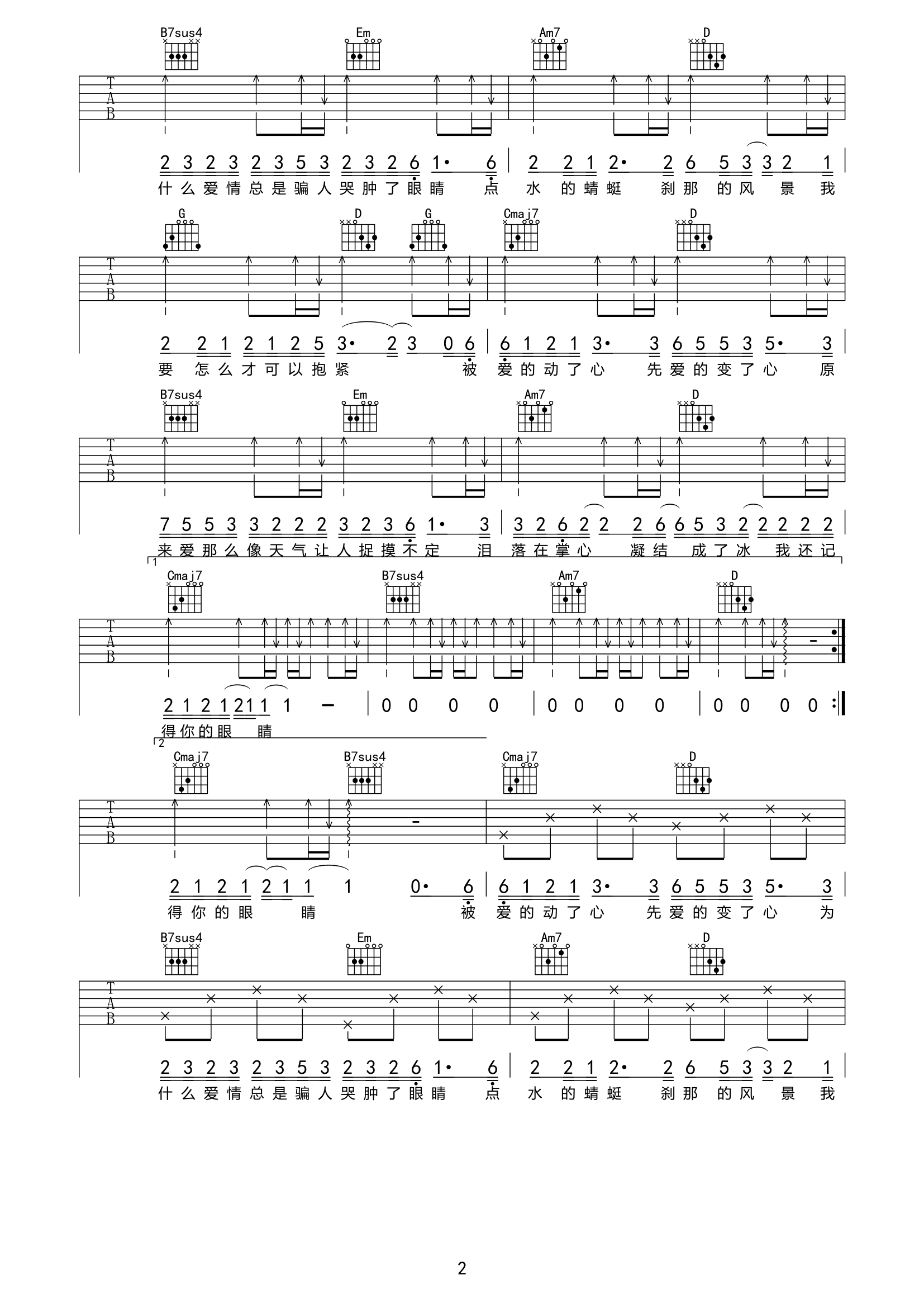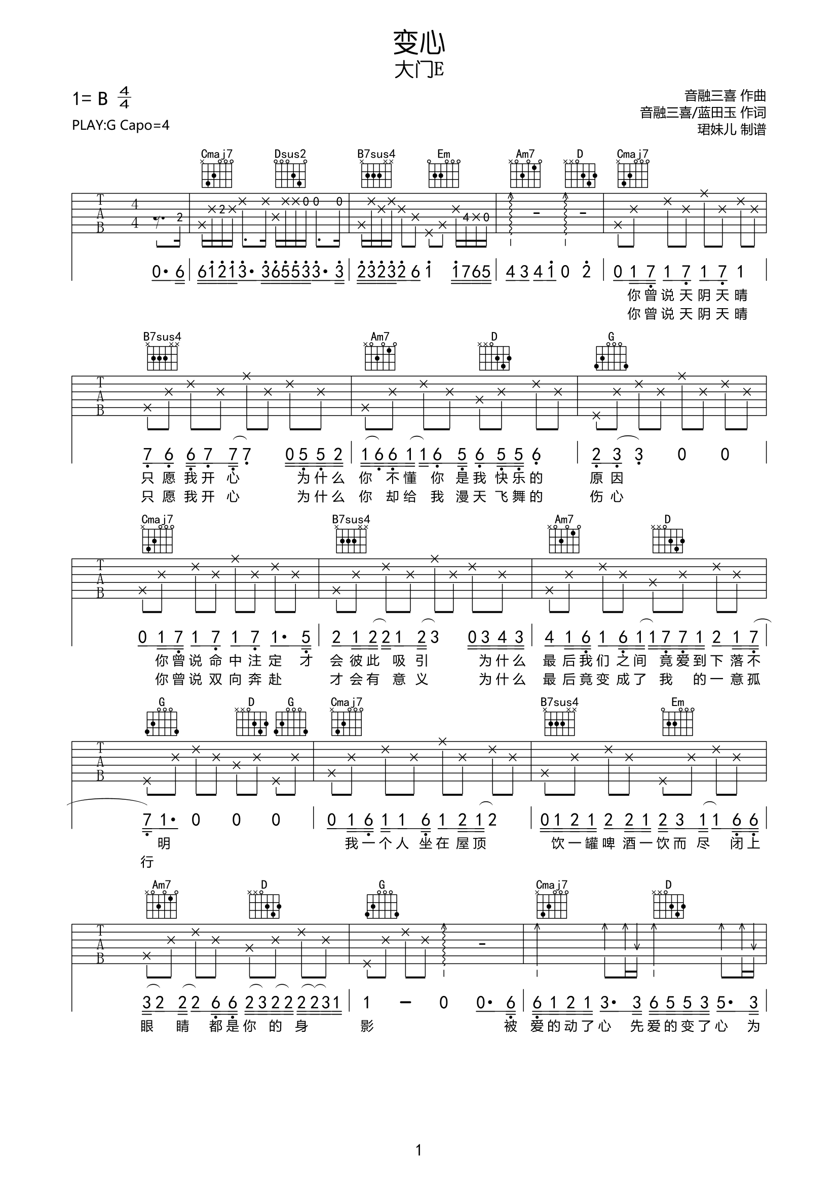 曲谱介绍: 变心吉他谱,由音融三喜创作,大门E演唱的一首伤感网络情歌,许多人的爱情走到中途便遗忘了最初的约定,很多说不清的理由总让我们捉摸不定,不是谁变了心,有时候是我们“失去”了看透对方内心的眼睛。 《变心》吉他弹唱谱,选用G调指法,原调B调,建议变调夹夹4品弹唱,包含简单原版前奏,弹唱难度初级较简单。