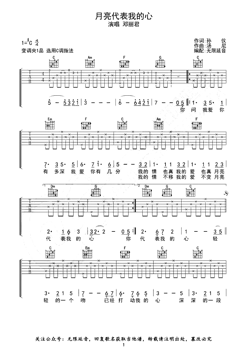 曲谱介绍: 邓丽君原唱的经典老歌《月亮代表我的心》,绵柔似水的嗓音,缓缓的述说着内心爱一个人的独白,没有复杂的词藻,没有层次叠起的曲调,一字一句将月光的柔情装进了我们充满爱意的心。 邓丽君《月亮代表我的心》吉他谱,由无限延音编配,选用C调指法,原调#C,建议变调夹夹1品弹唱原调,本谱包含简易版前奏,版本完整,难度初级简单。