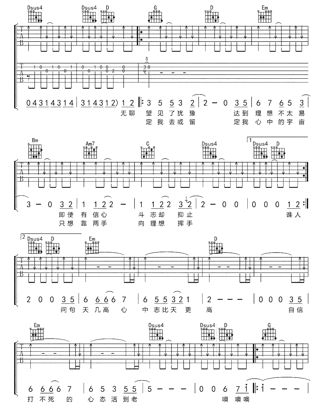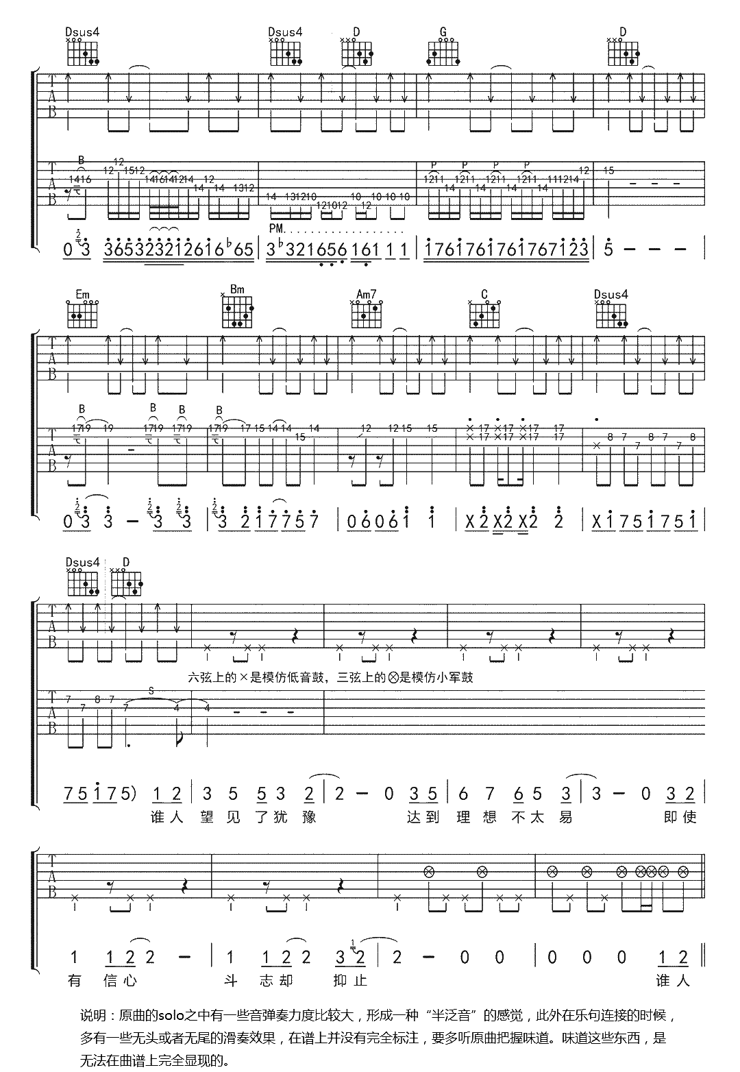 曲谱介绍: 不再犹豫吉他谱,“不再犹豫,迎难克艰”,这首歌曲用痛快洒脱的味道传递着“自信打不死”的精神,正是让我们感受到了无论到何时何地,应当保持着属于自己的那份执着与信心! Beyond《不再犹豫》吉他弹唱谱,完美双吉他版编配,共有四张高清图片谱,选用G调指法,扫弦节奏为全曲主要节奏型,难度适中。