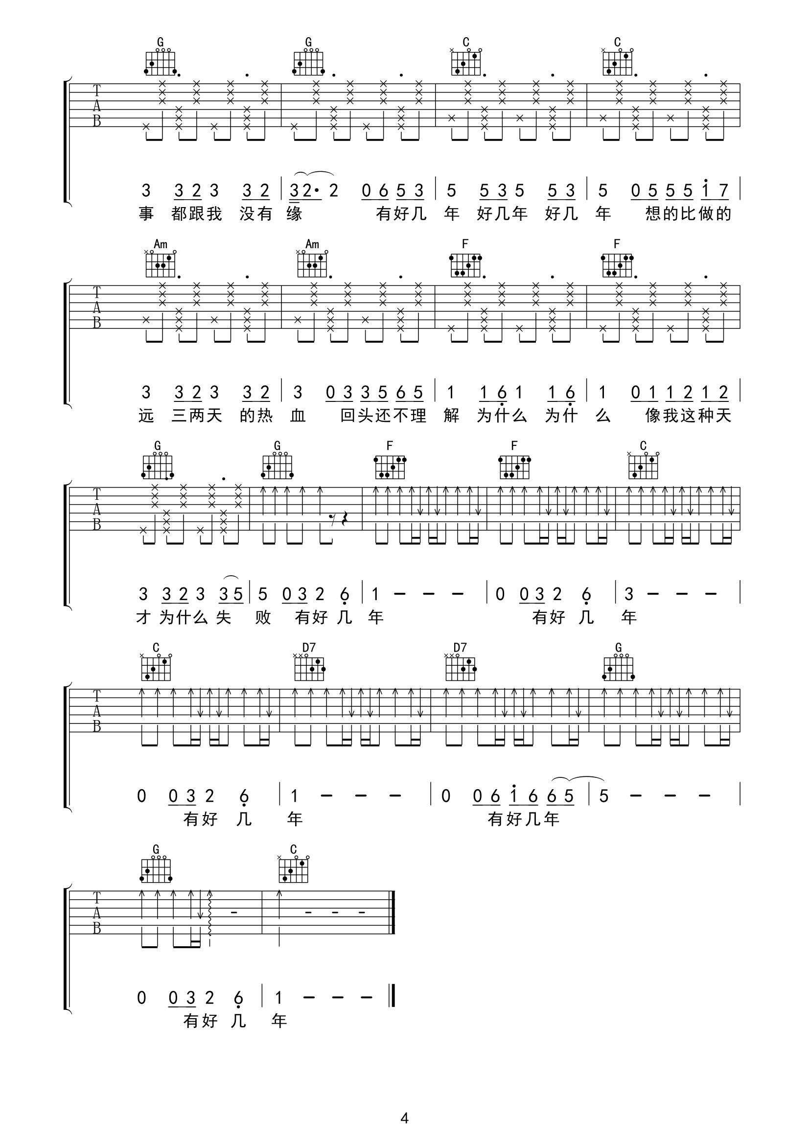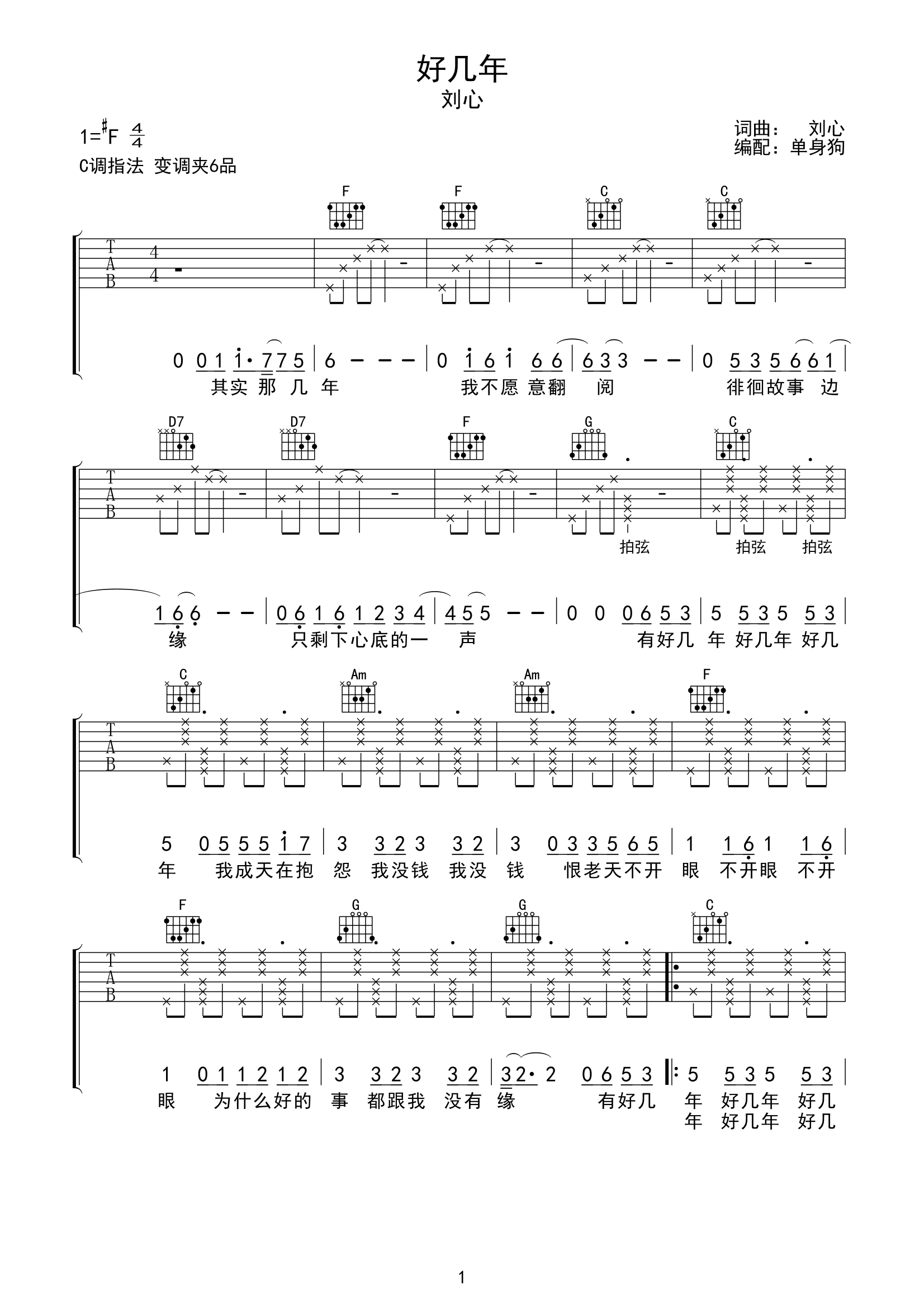 曲谱介绍: 好几年吉他谱,刘心创作并演唱,通俗上口的歌词唱着过往的旧时光,谁没有那“好几年”,那几年是心酸是痛苦还是欢乐,对于每个人必然有不一样的感受,而这首歌就是要尽情的洒脱抒发自己内心可能被掩藏着的心境。 《好几年》吉他弹唱谱,共四张高清六线谱图例,选用C调指法,原调#F,建议变调夹夹6品弹唱原调,难度初级简单,曲谱会用到拍弦的技巧,注意把握练习好节奏感即可。