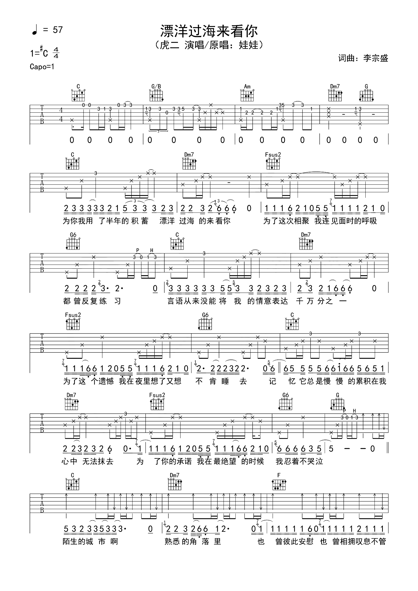 漂洋过海来看你吉他谱 - 虎二 - C调吉他弹唱谱 - 原版