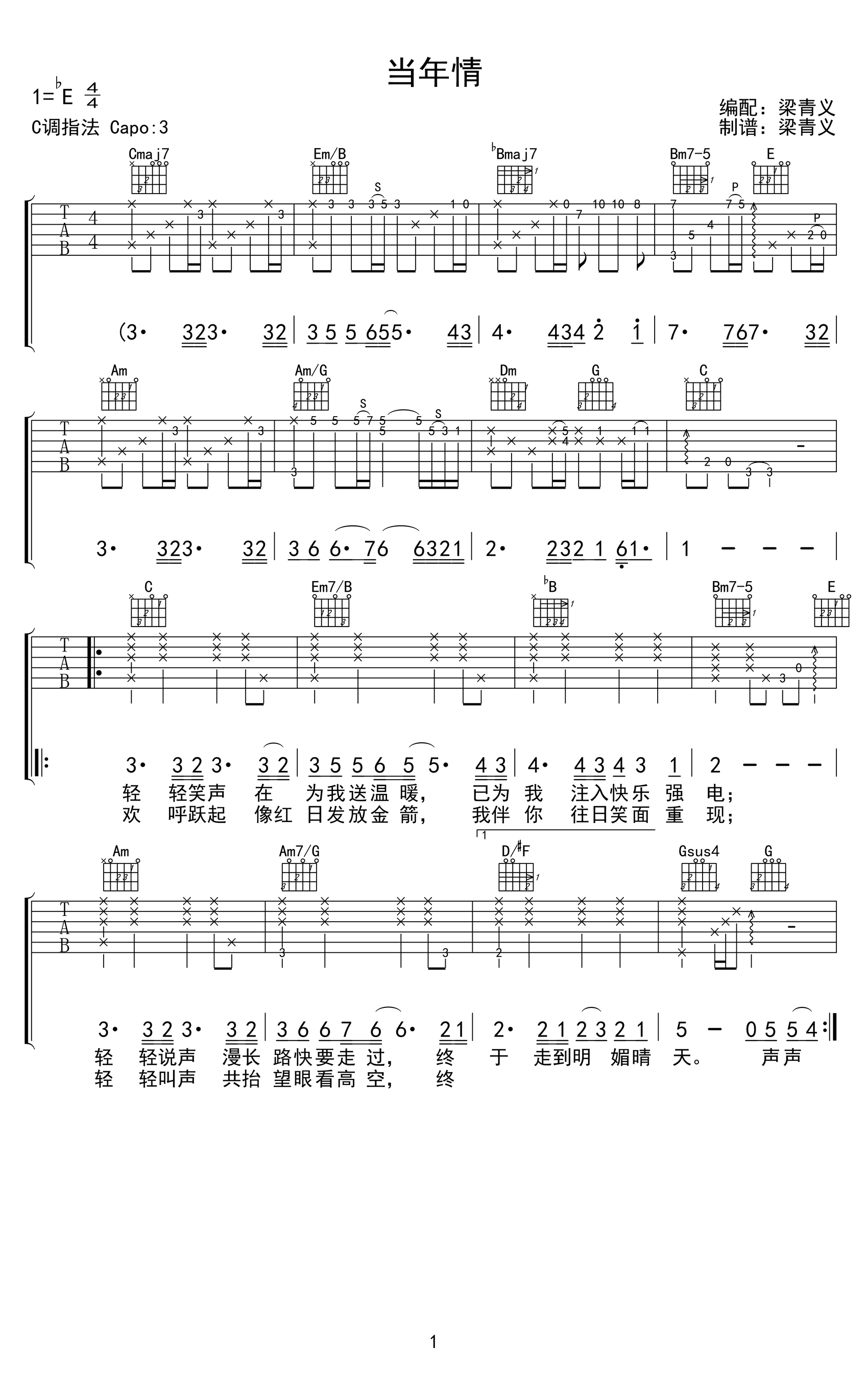 曲谱介绍: 《英雄本色》的主题曲《当年情》,熟悉的旋律如旧电影一般萦绕在我们脑中,青春的岁月仿佛又重现于眼前,浓浓当年情是一种深厚的兄弟友情,时到今日是否依然可以肩并肩共赴下一个明天。 张国荣《当年情》吉他谱,共3张精编版高清六线谱,选用C调指法,原调bE,节奏4/4拍,建议变调夹3品弹唱原调,难度初级较简单。