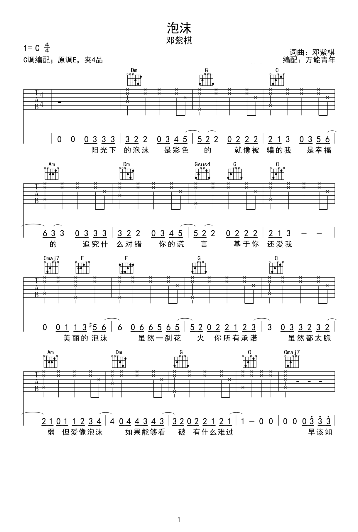 曲谱介绍: 邓紫棋《泡沫》,一首经典的伤感情歌,悲伤的旋律高潮层层叠起,仿佛沉浸着悲伤的呐喊,爱情就好比“泡沫”,美丽而又脆弱,让我们怀念起过去的伤感回忆。 邓紫棋《泡沫》吉他谱,共4张高清六线谱,选用C调指法,原调E调,节奏4/4拍,版本完整,变调夹夹4品可以弹唱原调,难度初级简单。