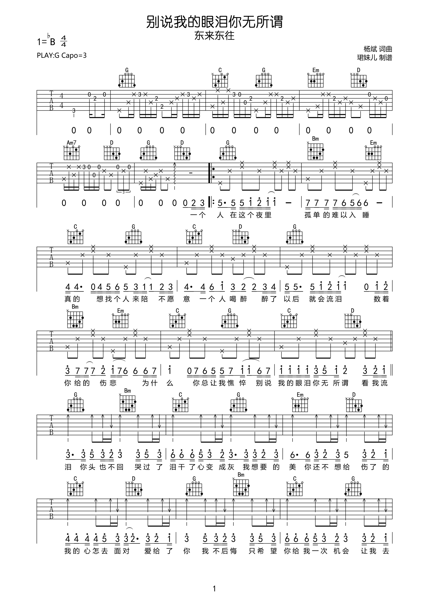 曲谱介绍: 别说我的眼泪你无所谓吉他谱,东来东往演唱的,由杨斌作词作曲,这首歌算得上早期十分著名的网络流行歌曲,用最纯粹的嗓音和直白的歌词,描述了一个人在感情上受伤且甘愿付出的状态,听到这首歌相信大家总能想起伤心往事。 《别说我的眼泪你无所谓》吉他弹唱谱,共两张高清六线谱,选用G调指法,原调bB,建议变调夹夹3品弹唱原调,本谱按原版编配,弹唱难度初级简单好上手。