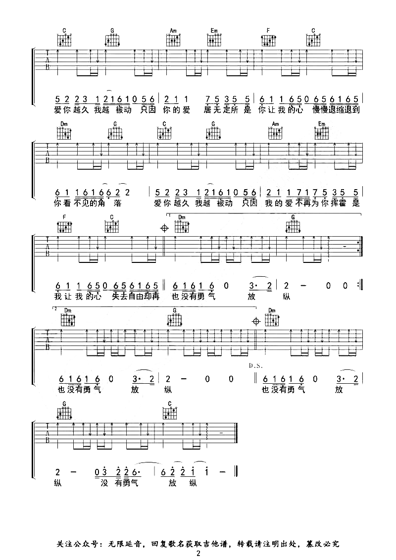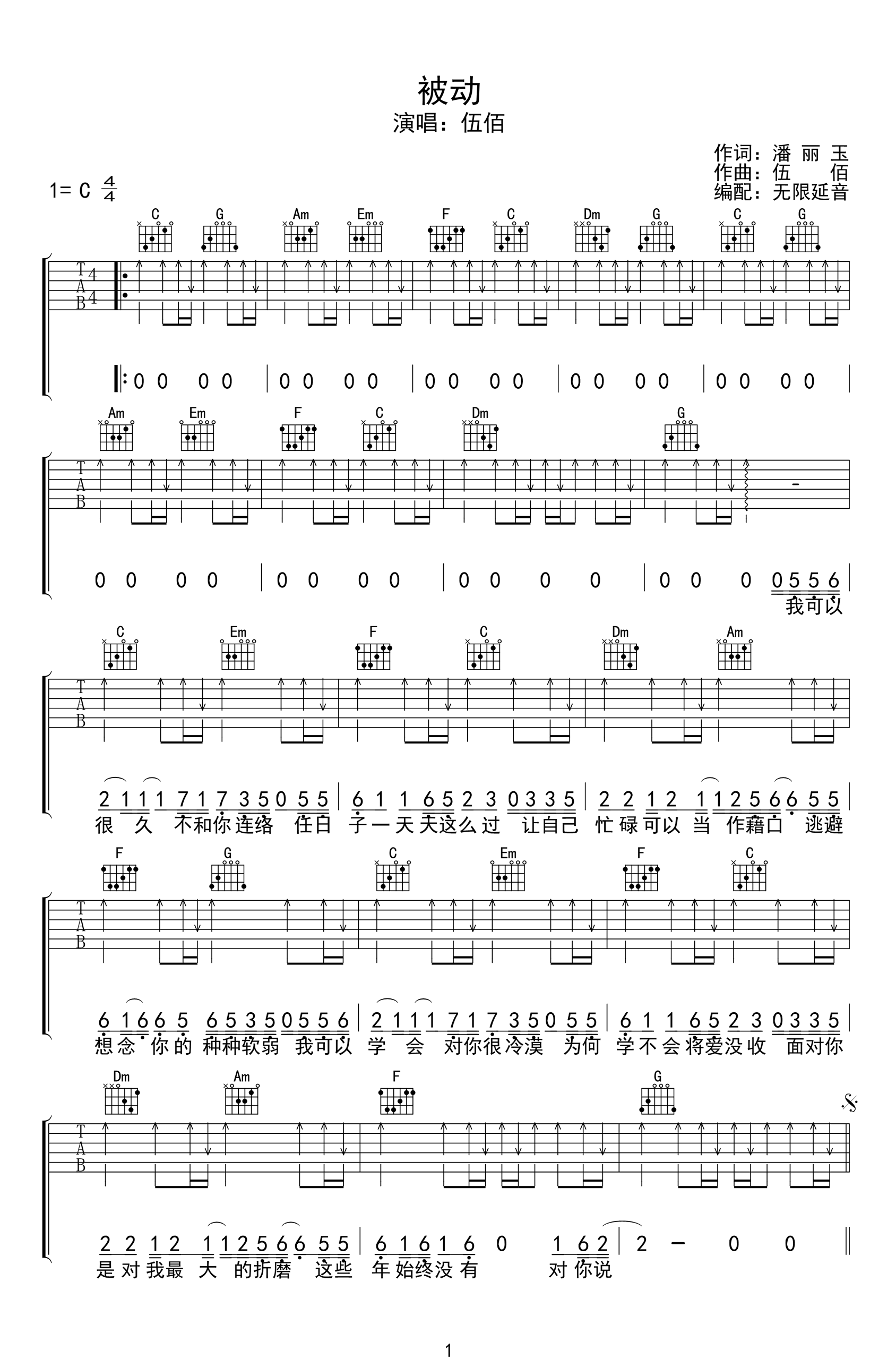 曲谱介绍: 伍佰《被动》,这是原本些给苏慧伦的老歌,旋律之中透出了洒脱的味道。 伍佰《被动》吉他谱,共两张图片谱,选用C调指法,扫弦版弹唱贯穿全曲,弹唱难度初级简单。