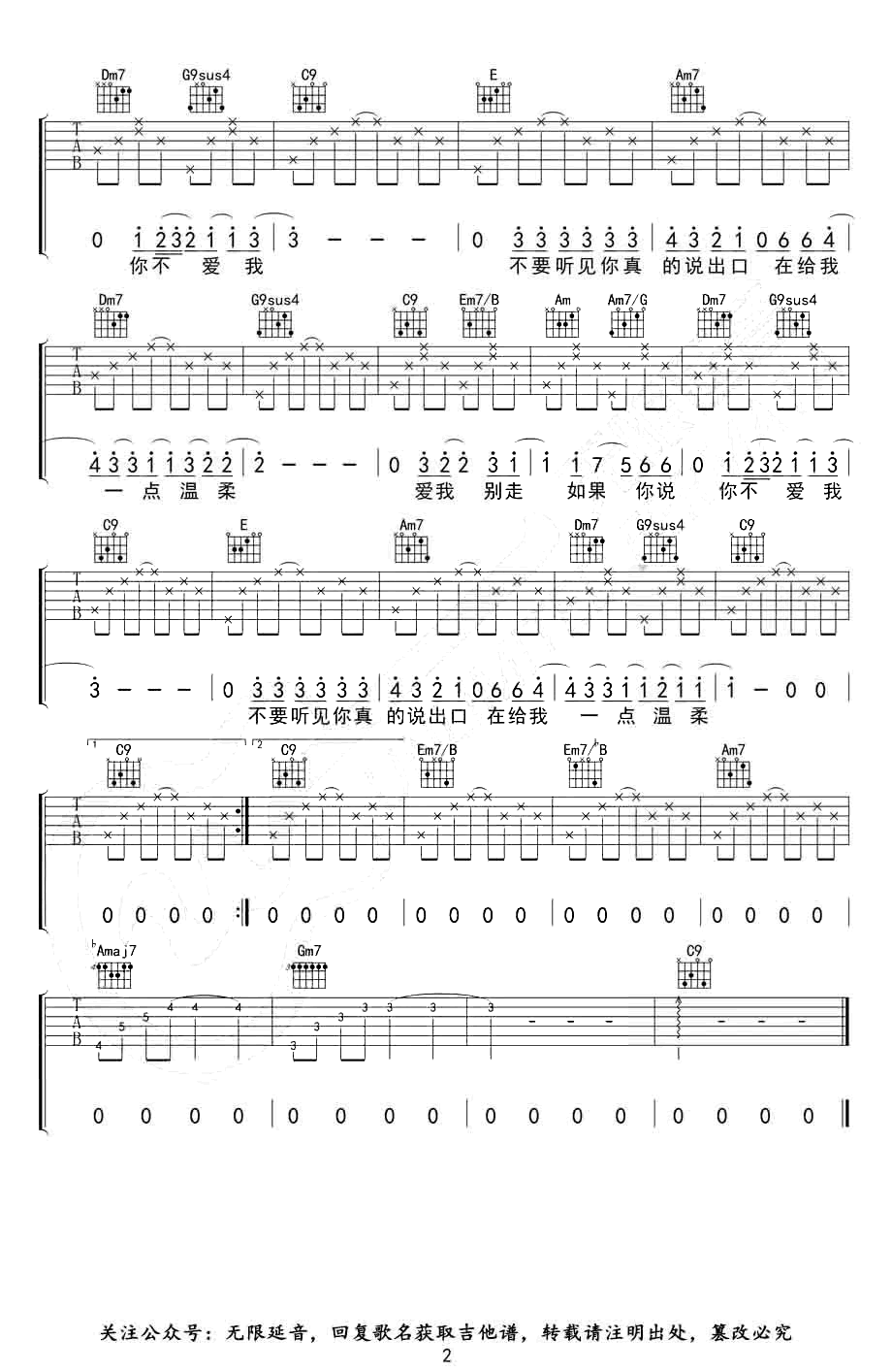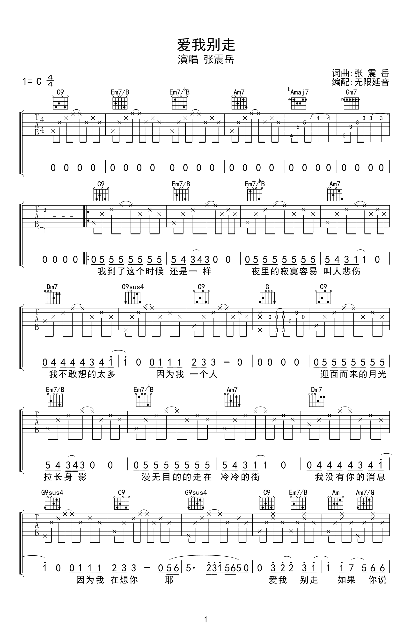 曲谱介绍: 张震岳《爱我别走》吉他谱,共两张图片谱,选用C调指法,标准调音弹唱,可不用变调夹,全曲按原版分解和弦弹唱,难度初级简单。