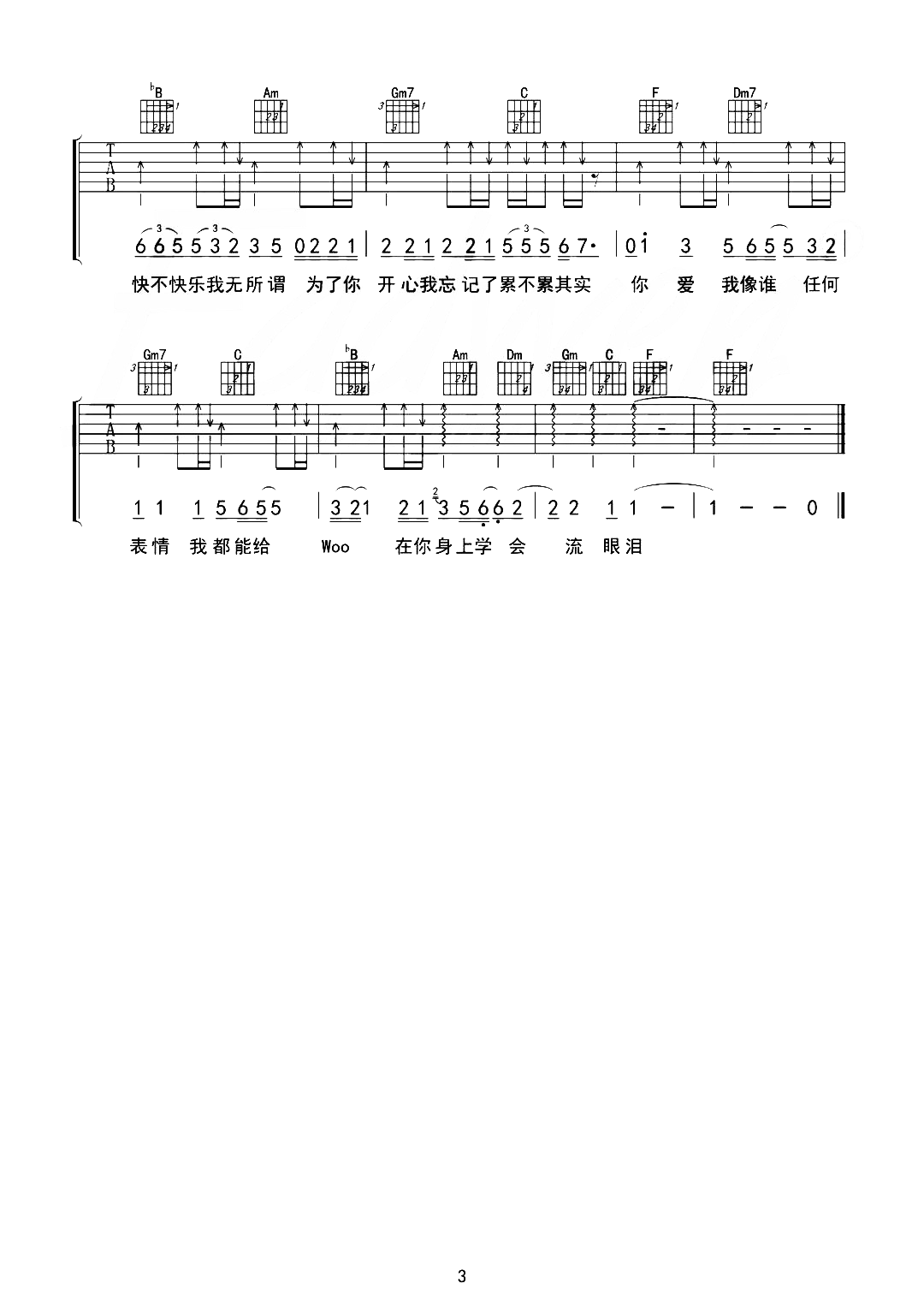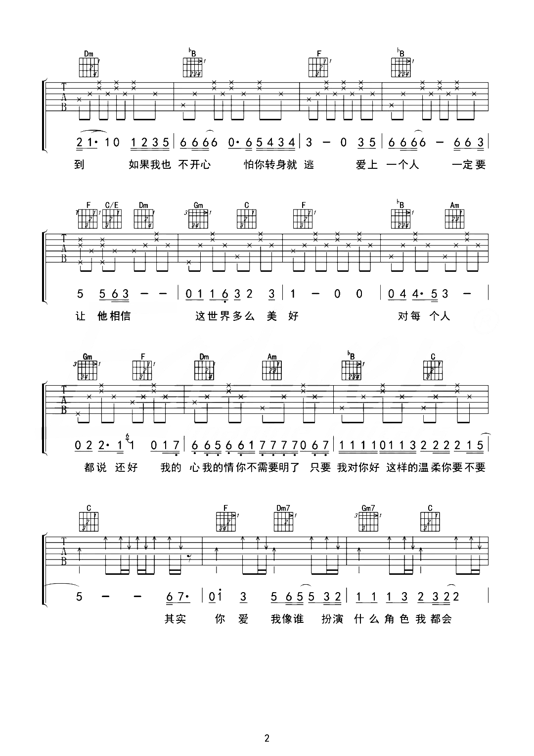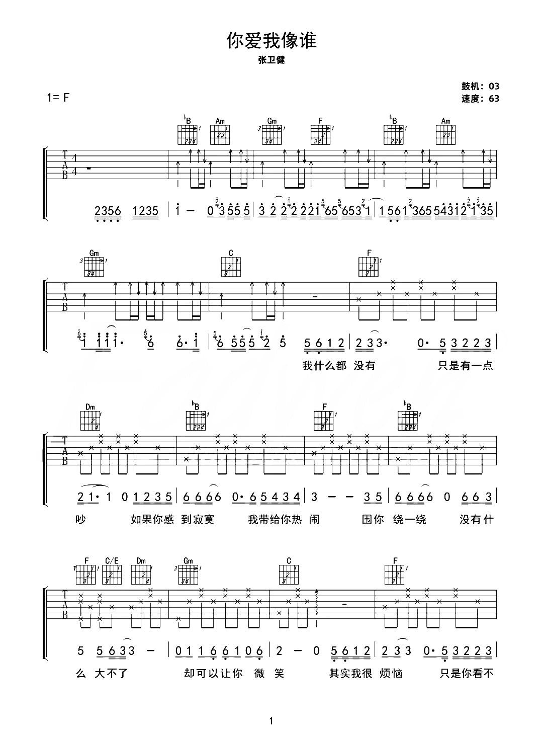 曲谱介绍: 张卫健《你爱我像谁》,熟悉的旋律激起人们记忆里的熟知影视剧画面,全是青春的味道,标准的情歌层次让这首歌成为经典,“你爱我像谁”这句词刻画出了生活中许多人都容易出现的恋情状态,正如很多人因为爱一个人,愿意付出努力牺牲自己变为对对方的想要的样子。 张卫健《你爱我像谁》吉他谱,共3张高清六线谱图例,选用C调指法编配,原调F调,弹唱原调可夹5品,底部附有本首歌曲的和弦走势图,可供大家参考。