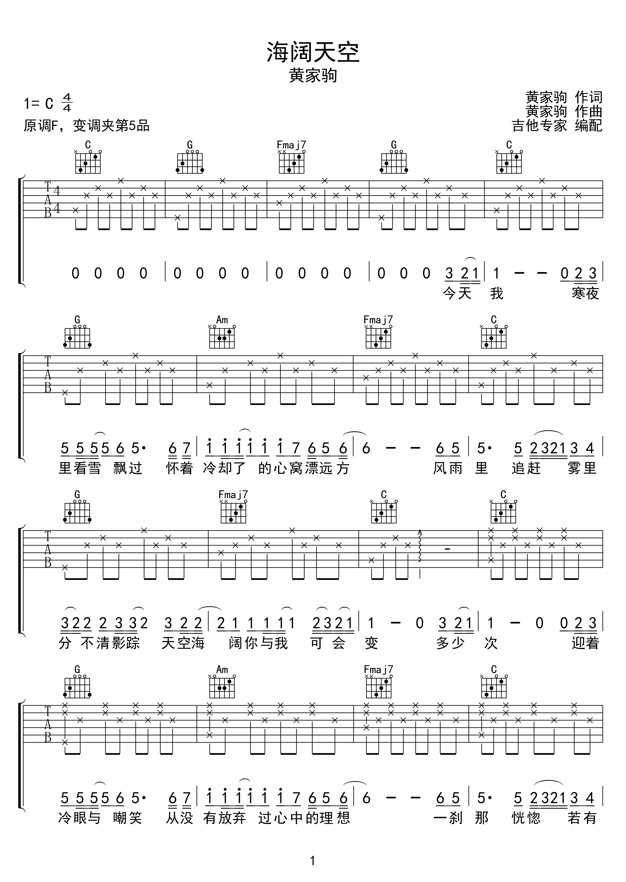 曲谱介绍: 海阔天空吉他谱,Beyond家驹在时的最后一首歌,旋律温柔中充满了波澜,看似风平浪静,却是经历波澜之后的淡然从容,歌曲也让我们感受到,人这一生总非事事如意,但我们总应该退一步去看到自己的海阔天空,也许会是别样景色。 《海阔天空》吉他弹唱谱,共两张图片谱,选用C调指法,原调F调,变调夹可夹5品弹唱,全曲以标准分解和弦弹唱,难度初级简单,比较适合新手。
