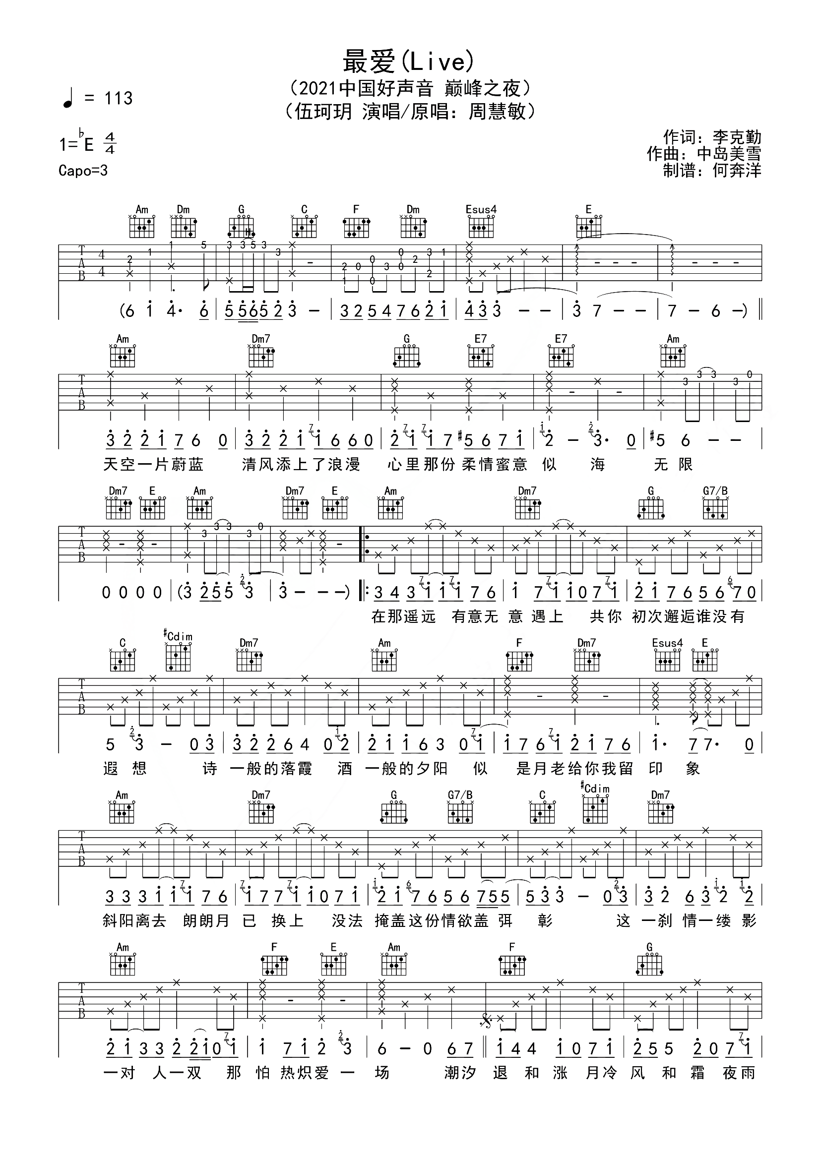 曲谱介绍: 伍珂玥在好声音决赛巅峰之夜翻唱周慧敏的《最爱》,温婉的嗓音和粤语歌曲完美融合,最合适的感情诠释着无法隐藏的爱,让大家顿时对这首经典歌曲心生怀念,难易释怀。 伍珂玥《最爱》吉他谱,共有两张高清六线谱,选用C调指法,原调bE,建议变调夹夹3品弹唱原调,难度初级简单。