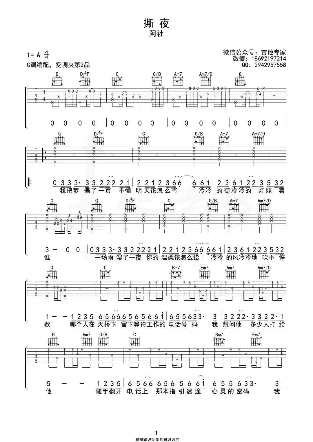 曲谱介绍: 20年前,一首歌《撕夜》引起了大家的共鸣。阿杜用他独特而嘶哑的声音诠释了这首歌。这首歌完全描绘了真实的场景,唱出了务工人员许多时候无奈的心情。 撕夜吉他谱,共两张高清六线谱,《撕夜》原版六线谱,选用G调指法,原调A调,变调夹夹2品弹唱原调,本谱含有前奏和尾奏,较为接近原版,弹唱难度初级简单。