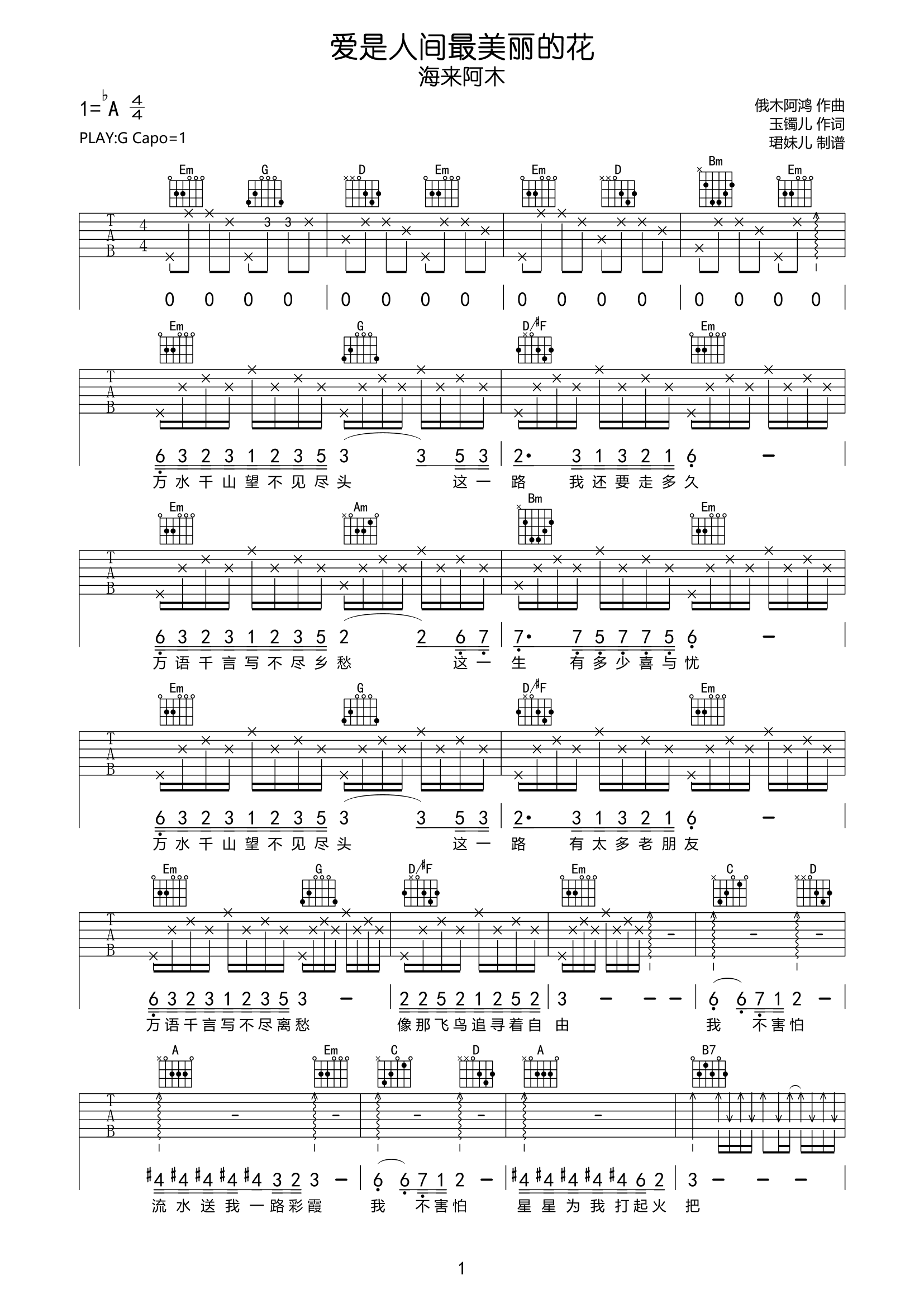 曲谱介绍: 爱是人间最美丽的花吉他谱,海来阿木的一首抒情歌曲,舒缓优美的旋律,依然保持着阿木的一贯风格,本曲用无尽的自然美好刻画着人间的挚爱,世间花朵千千万,都不及我们心中最纯粹的挚爱。 海来阿木《爱是人间最美丽的花》吉他弹唱谱,选用G调指法,共两张高清六线谱,选用G调,原调bA,变调夹建议夹1品弹唱,难度初级简单,本曲按原版编配。